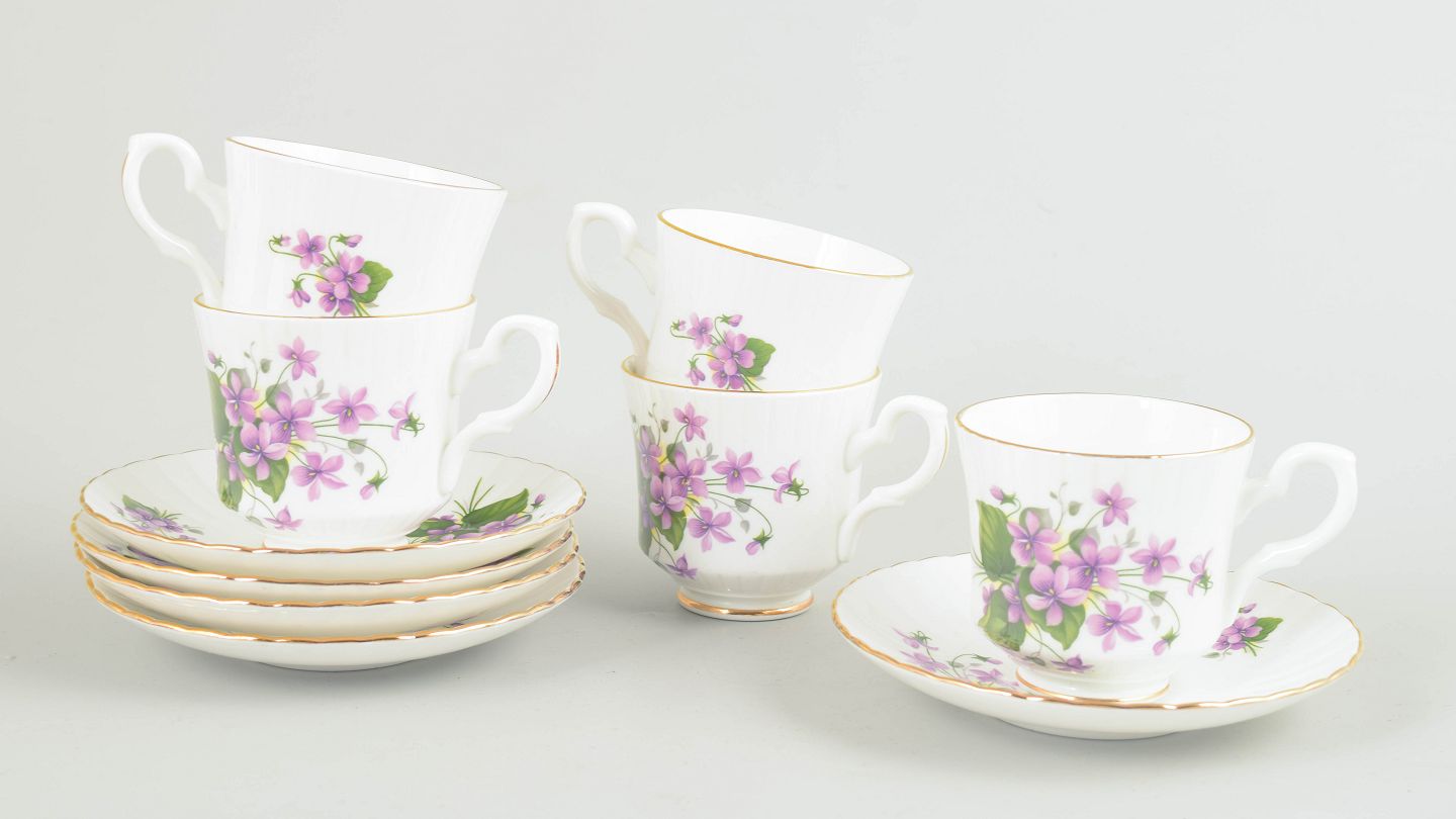 Sæt på fem kaffekopper og tilhørende underkopper i benporcelæn, dekoreret med violette blomster og grønne blade samt guldkant. Fremstillet af Royal Stafford, England.