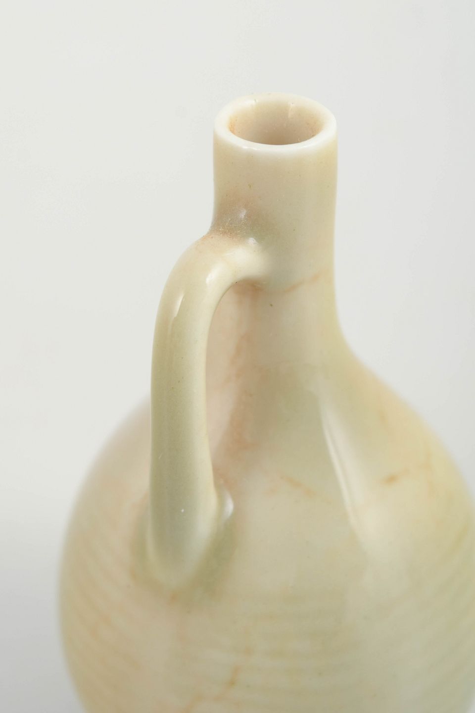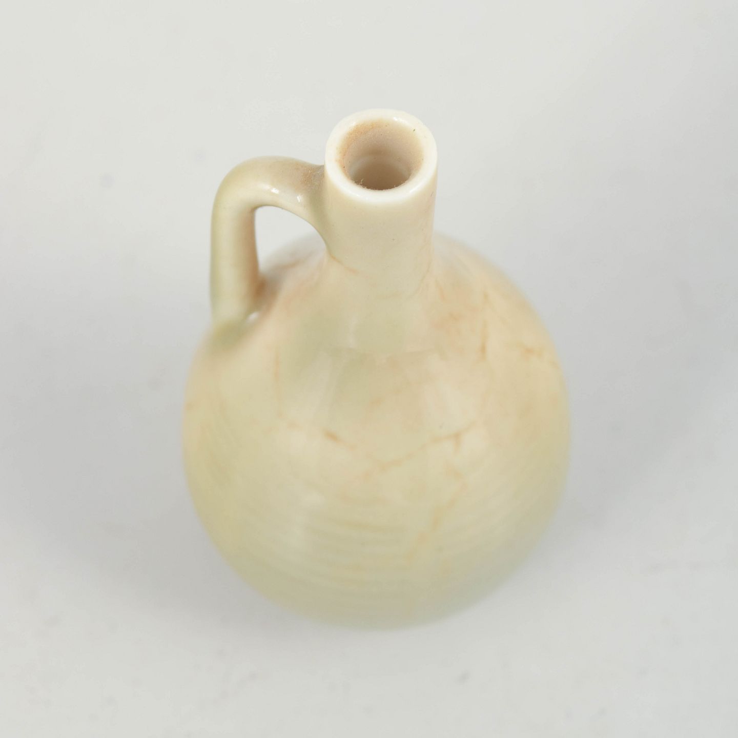 Lille organisk formet miniaturekande i glaseret stentøj med blød cremefarvet glasur. Signeret i bunden.