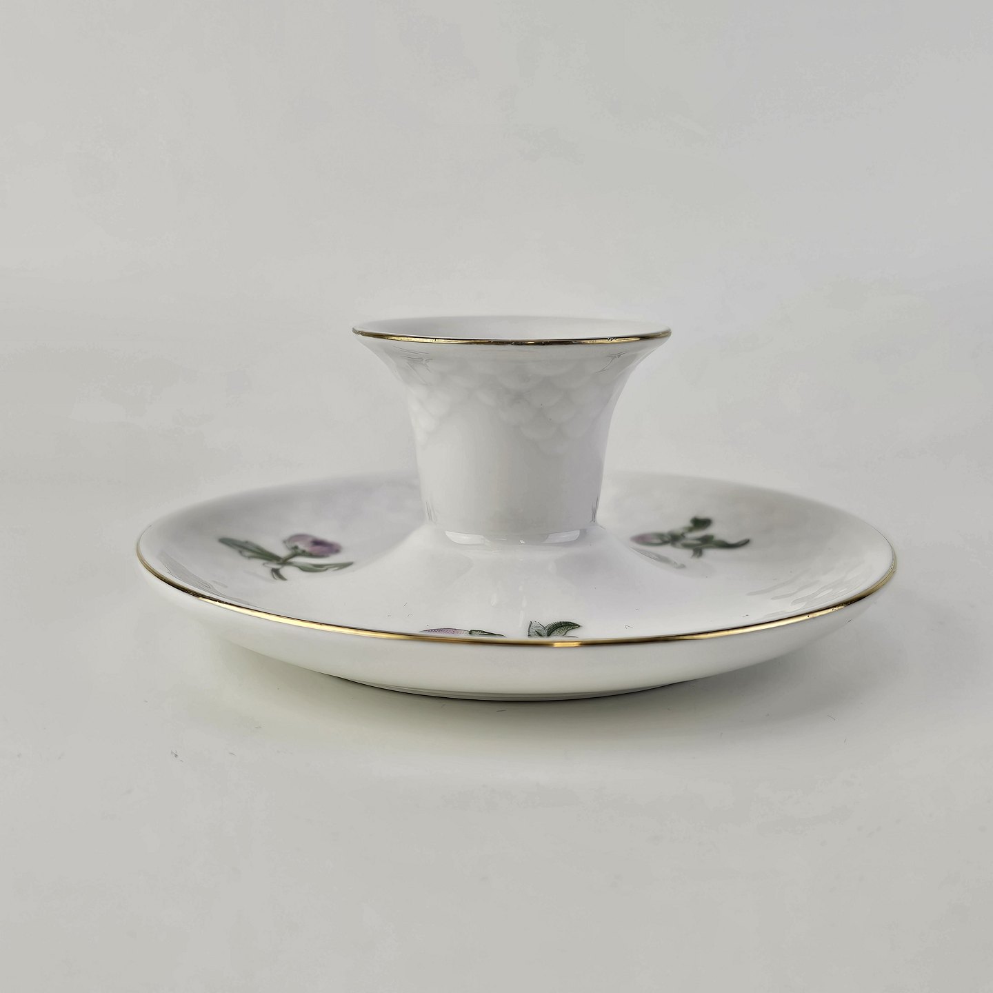 Krysantemum er hvidt porcelæn dekoreret med lys lilla blomst, grønne blade og guldkant.