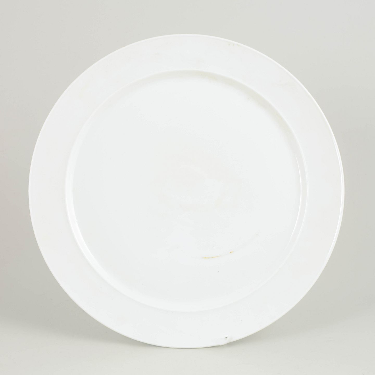Stort rundt serveringsfad i hvidglaseret porcelæn med bred fane. Produceret i Tyskland og mærket på undersiden med grønt Rosenthal-stempel.