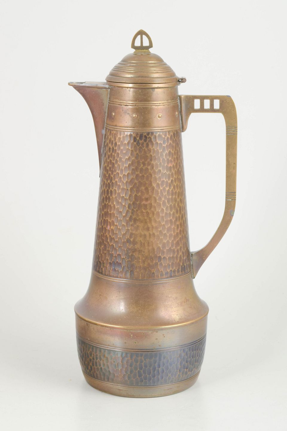Høj konisk kaffekande udført i hamret kobber med profileret fod, svungen tud og geometrisk håndtag. Låget er med drejet knop og integreret hængsel. Klassisk Jugendstil-formgivning fra begyndelsen af 1900-tallet.