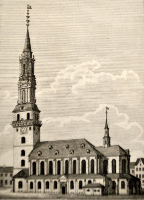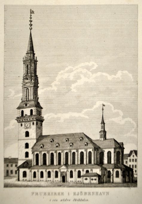 Ubekendt kunstner (19. årh.): Fruekirke i Kjöbenhavn i sin ældre skikkelse. Kobbertryk. H: 26 cm. B: 17 cm.