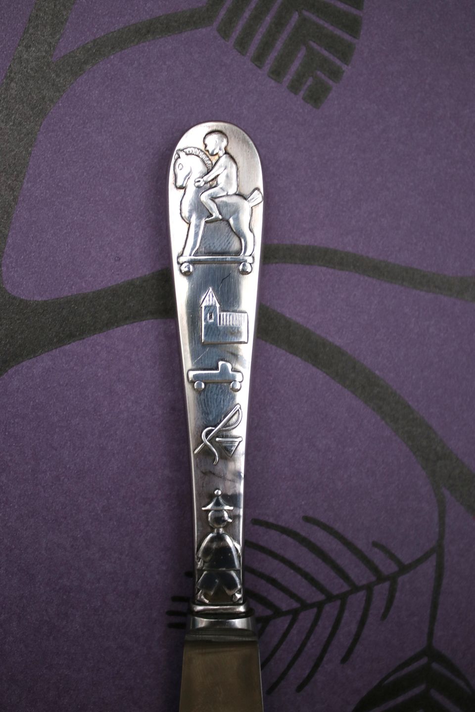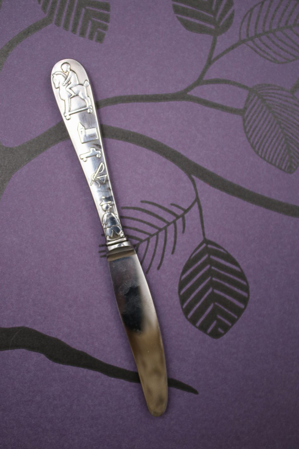 Børnekniv i sølv (stemplet) med børnemotiver på skaftet.