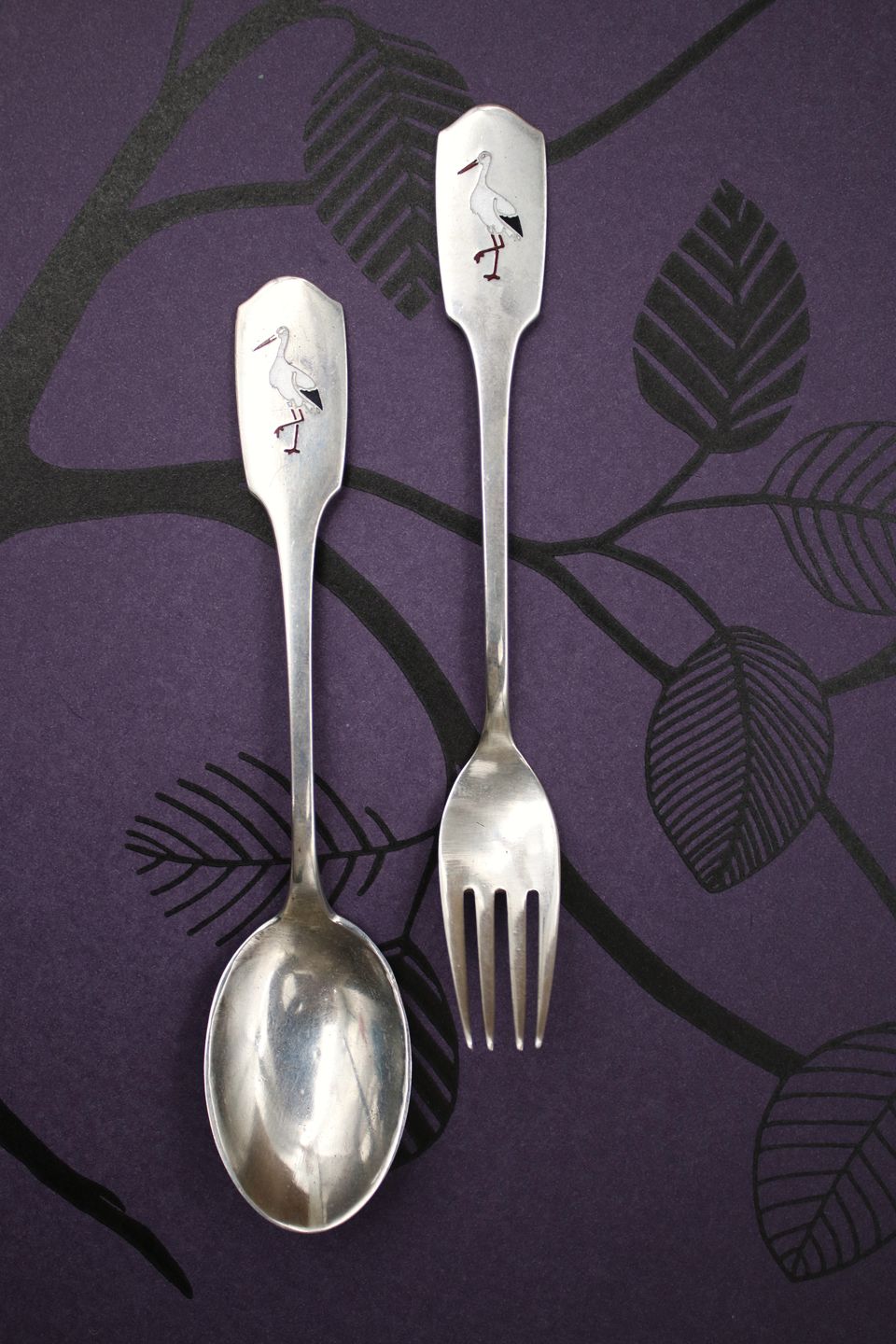 Barnebestik , ske og gaffel i sølv (stemplet) med storke motiv øverst på skaftet. L: 15cm. Vægt: 52,5 gram. (sælges kun samlet)