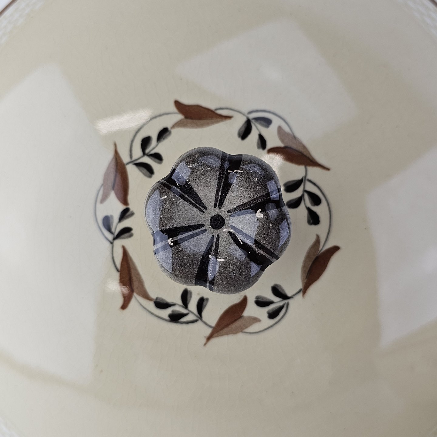 Knud er cremefarvet fajance dekoreret med flettet kant og brune og orange blomster. Stellet blev produceret i år 1934-1963.