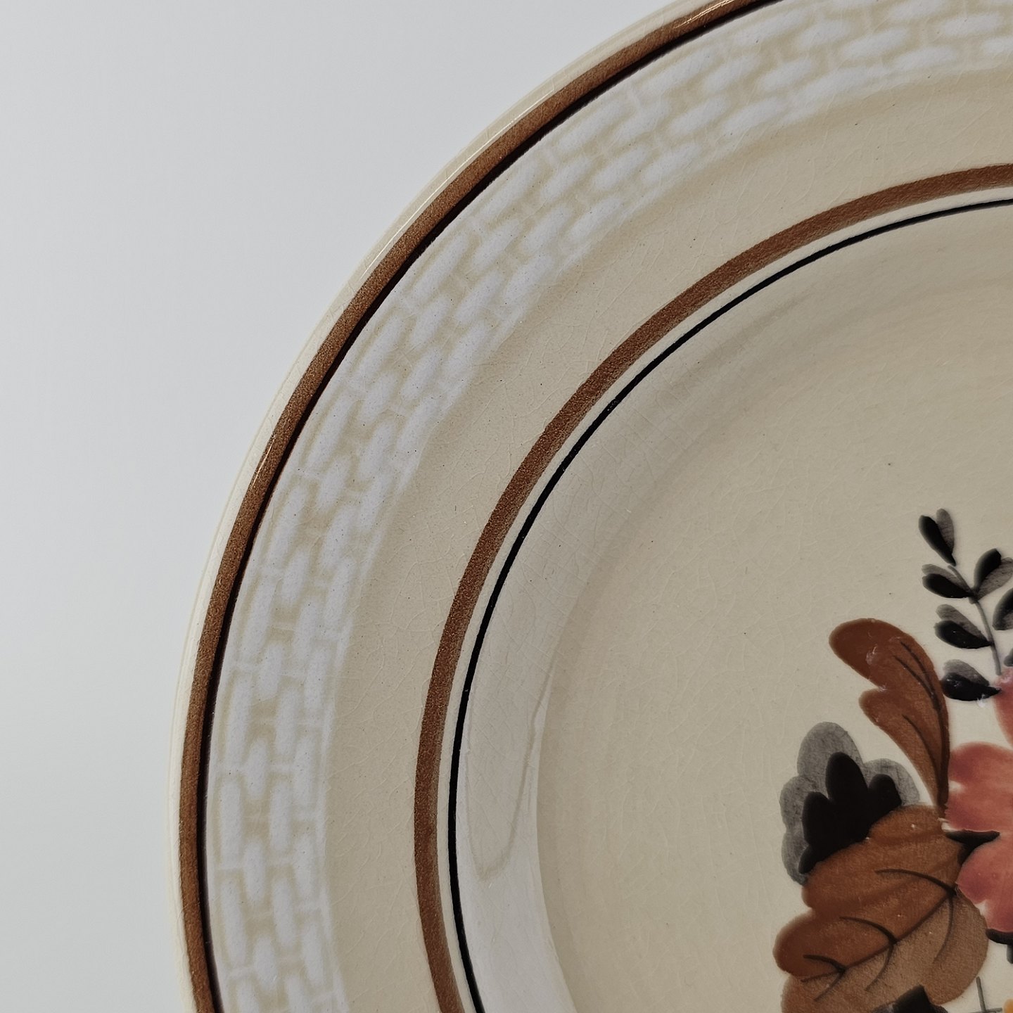 Knud er cremefarvet fajance dekoreret med flettet kant og brune og orange blomster. Stellet blev produceret i år 1934-1963.