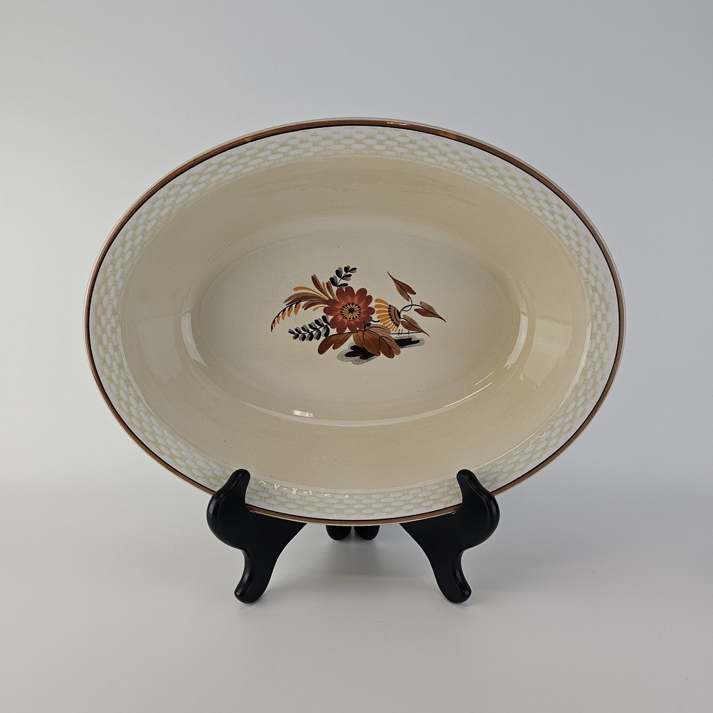 Knud er cremefarvet fajance dekoreret med flettet kant og brune og orange blomster. Stellet blev produceret i år 1934-1963.