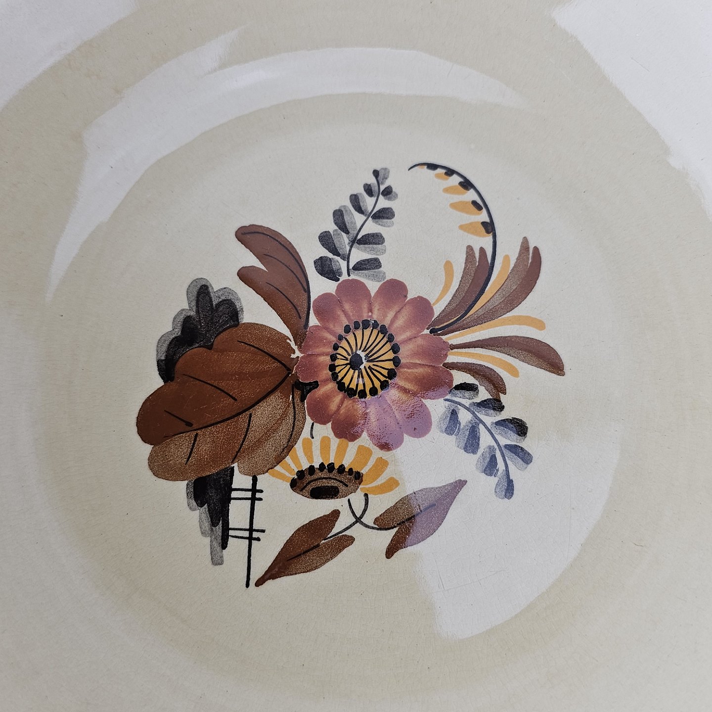 Knud er cremefarvet fajance dekoreret med flettet kant og brune og orange blomster. Stellet blev produceret i år 1934-1963.