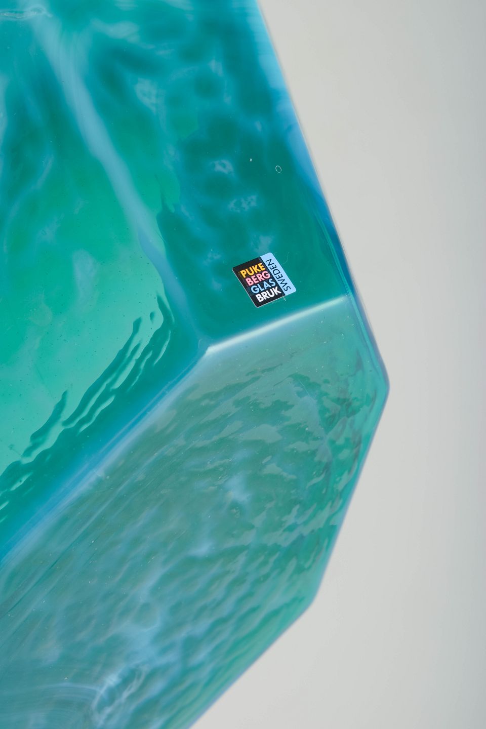 Stor ottekantet skål i kraftigt kunstglas med levende turkisblå nuancer og marmoreret struktur. Fremstillet hos Pukeberg Glasbruk og bevaret med original mærkat.