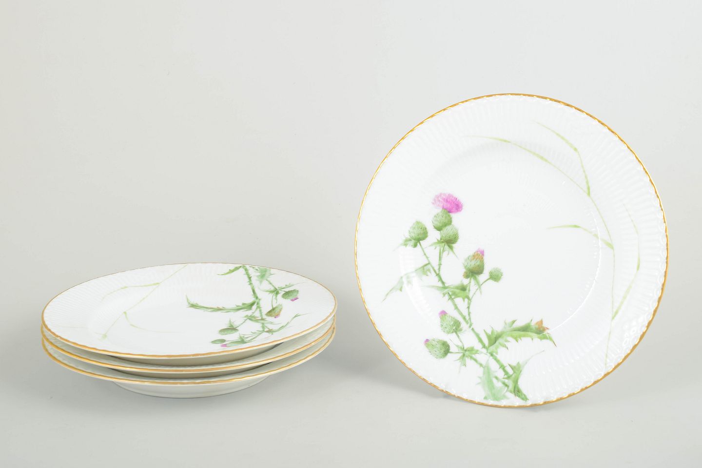 Sæt af fire middagstallerkener i håndmalet porcelæn fra Tidsel serien. Dekoreret med naturalistisk tidselmotiv i grønne og rosa nuancer samt forgyldt kant. Første sortering.