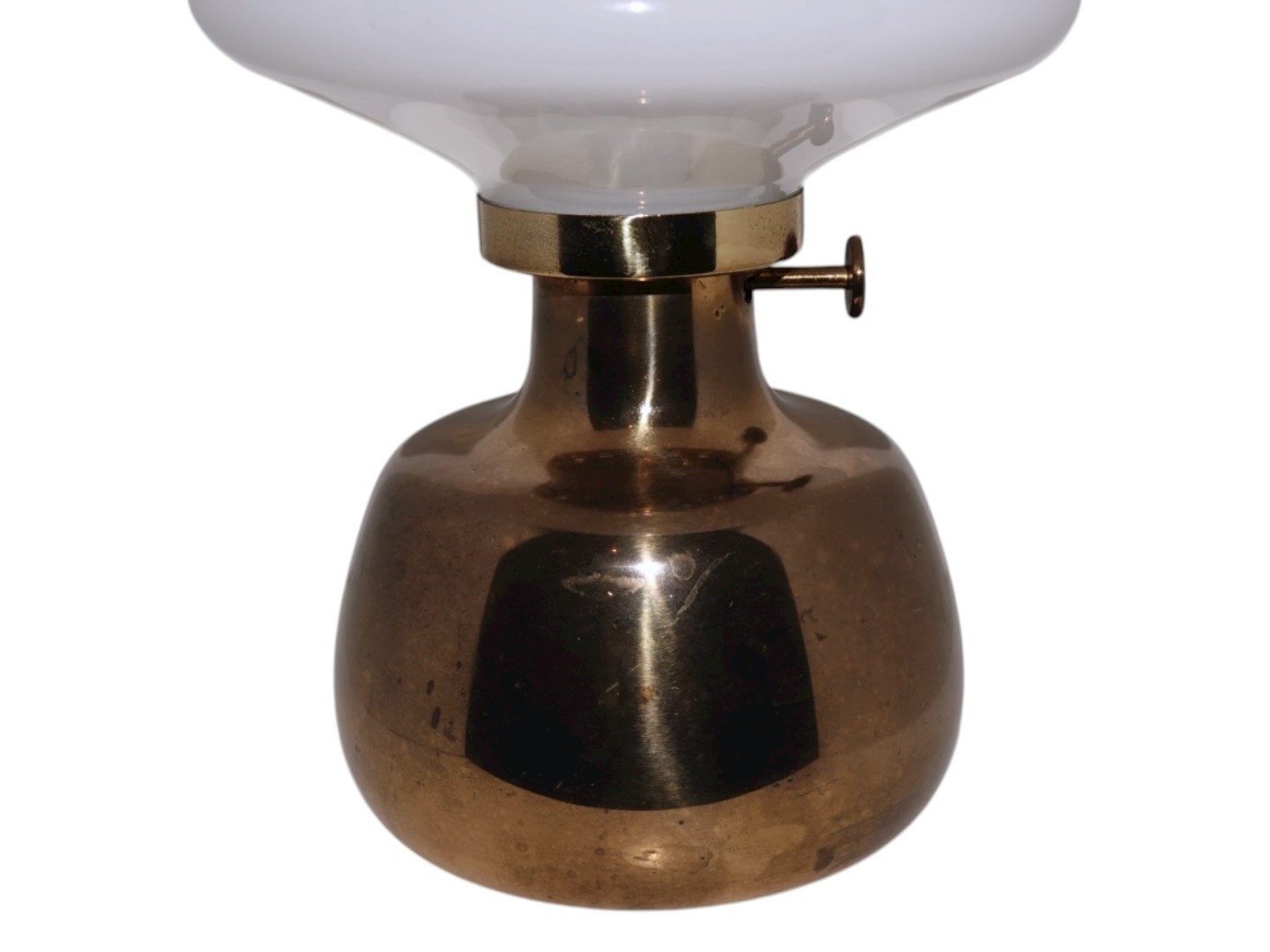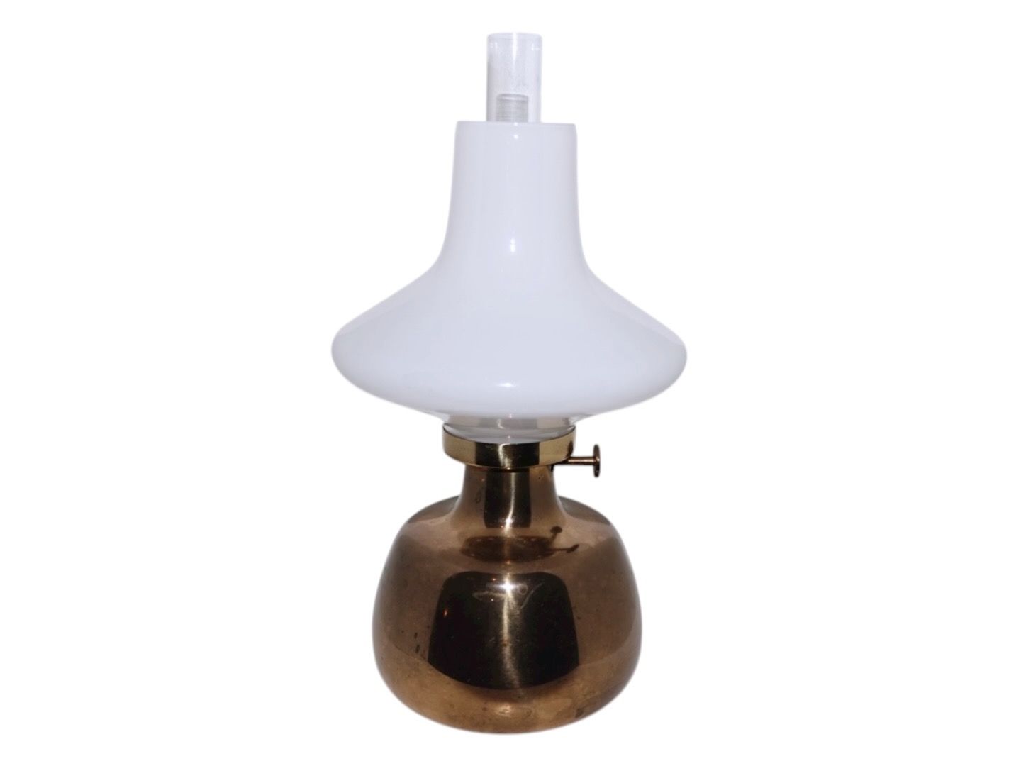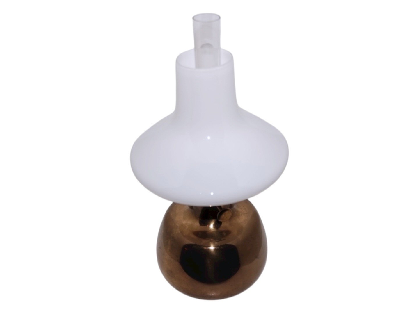 Petronella petroleumslampe med hvid opalglas skærm fra Holmegaard.