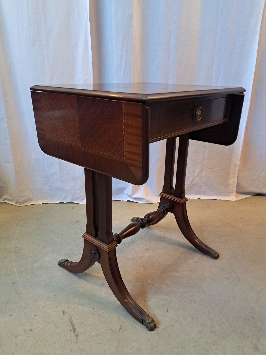 Bord med klapper og skuffe i fineret mahogni, fra 1980erne.