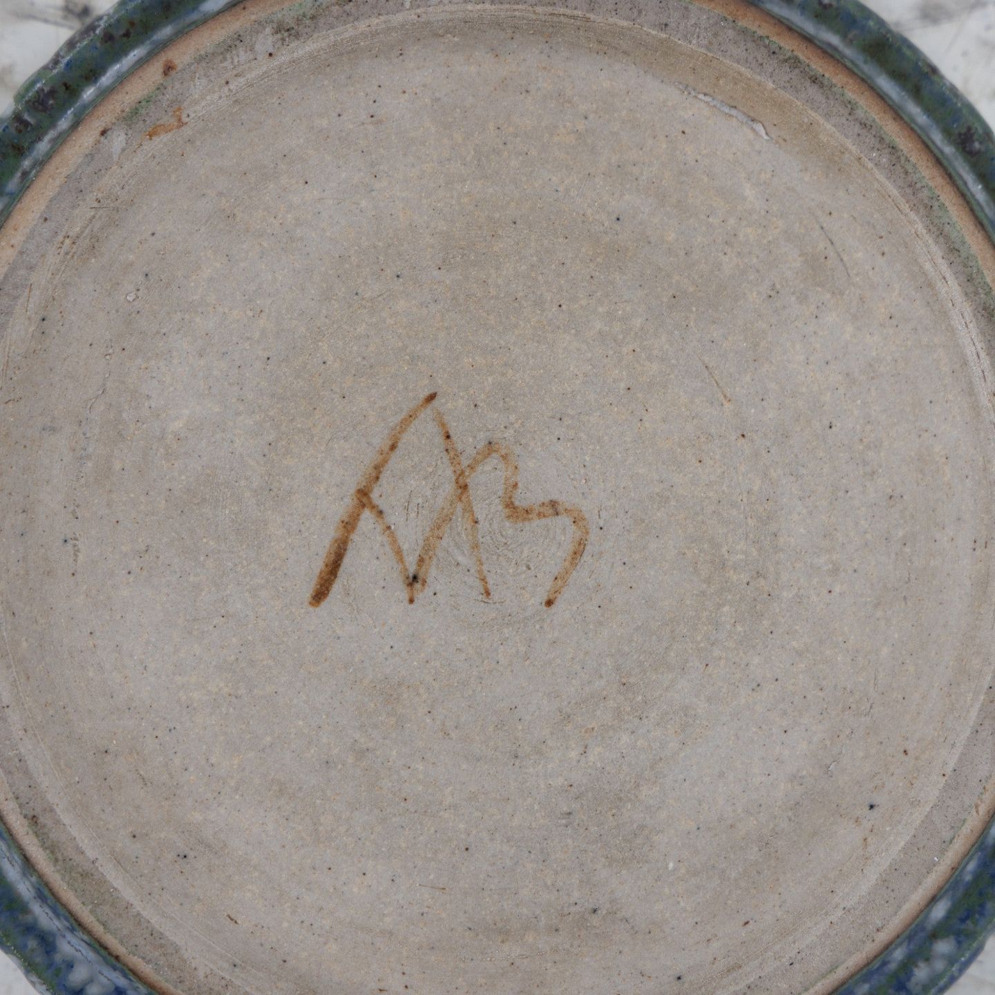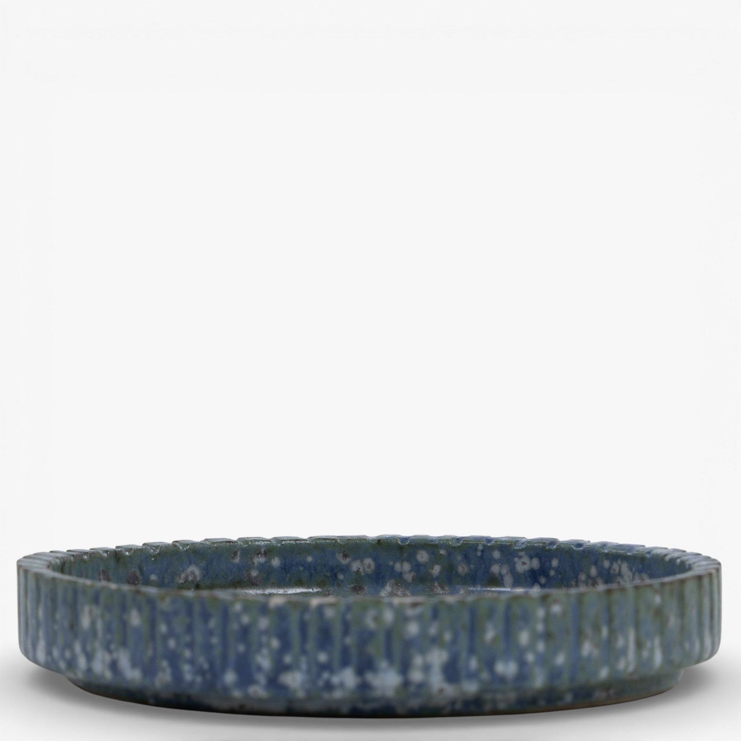 Rundt fad i riflet stentøj med blågrøn glasur. Signeret.