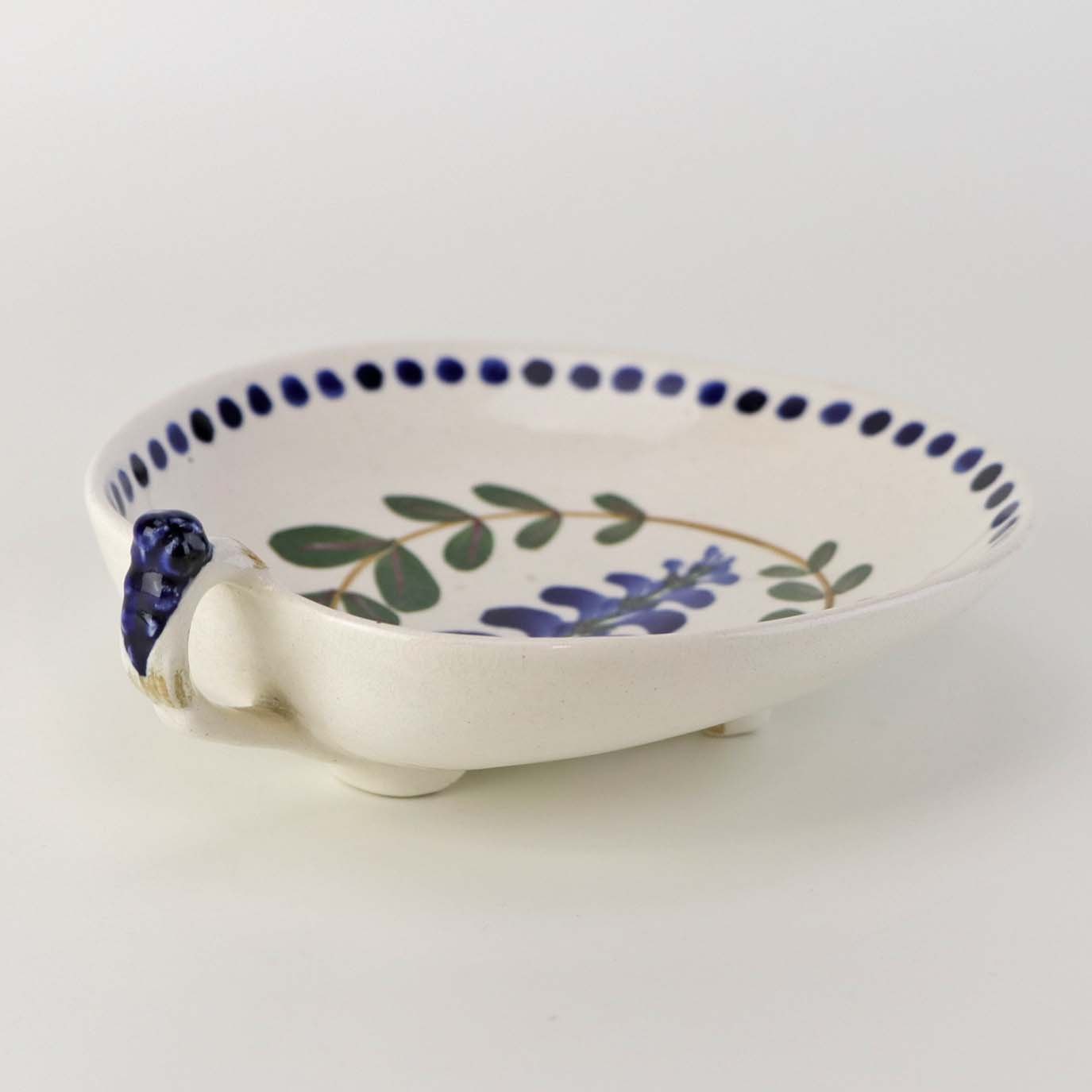 Lille asiet på fod og med hank i fajance fra stellet Blåregn. Stellet er fremstillet i perioden år 1903-1933. Nr. 522/187