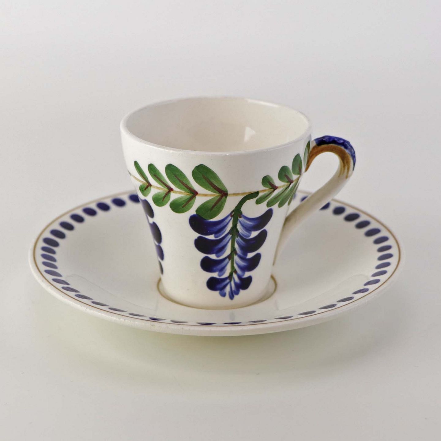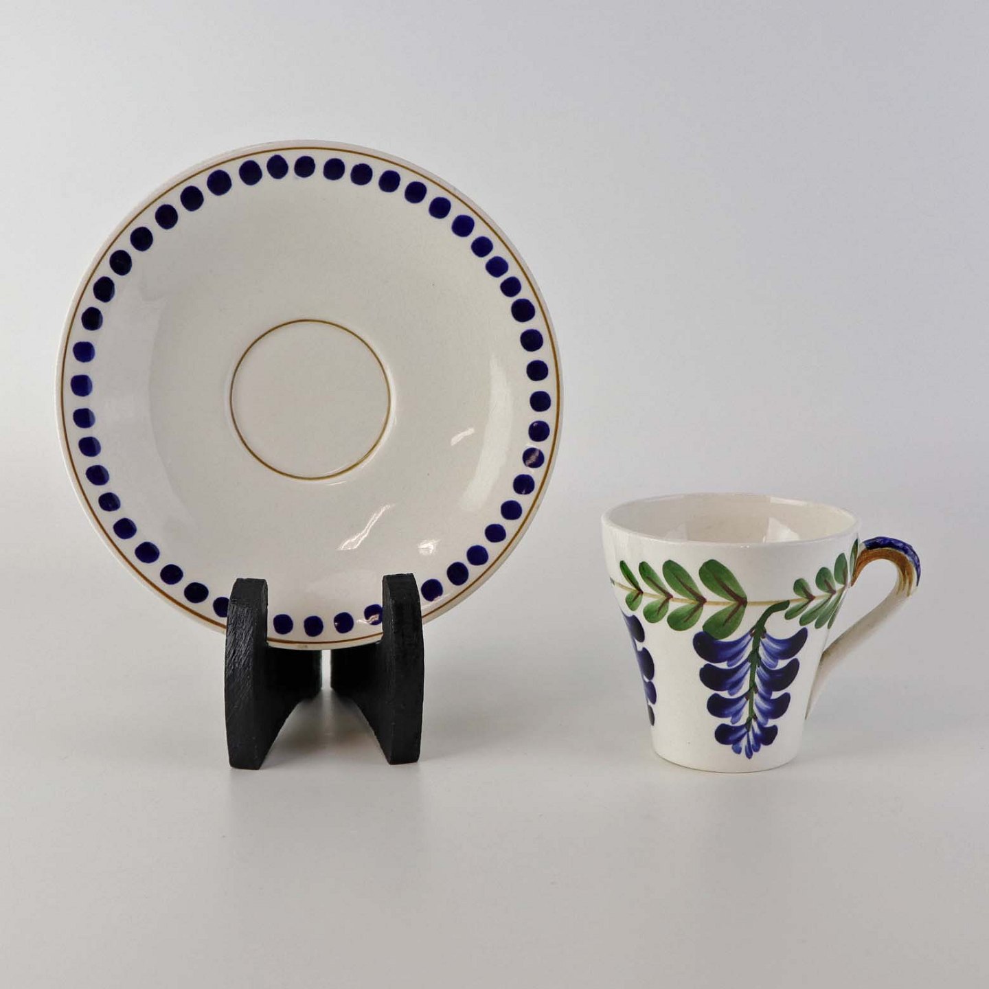Lille kaffe eller moccakop med underkop i fajance fra stellet Blåregn. Stellet er fremstillet i perioden år 1903-1933. Nr. 522/182