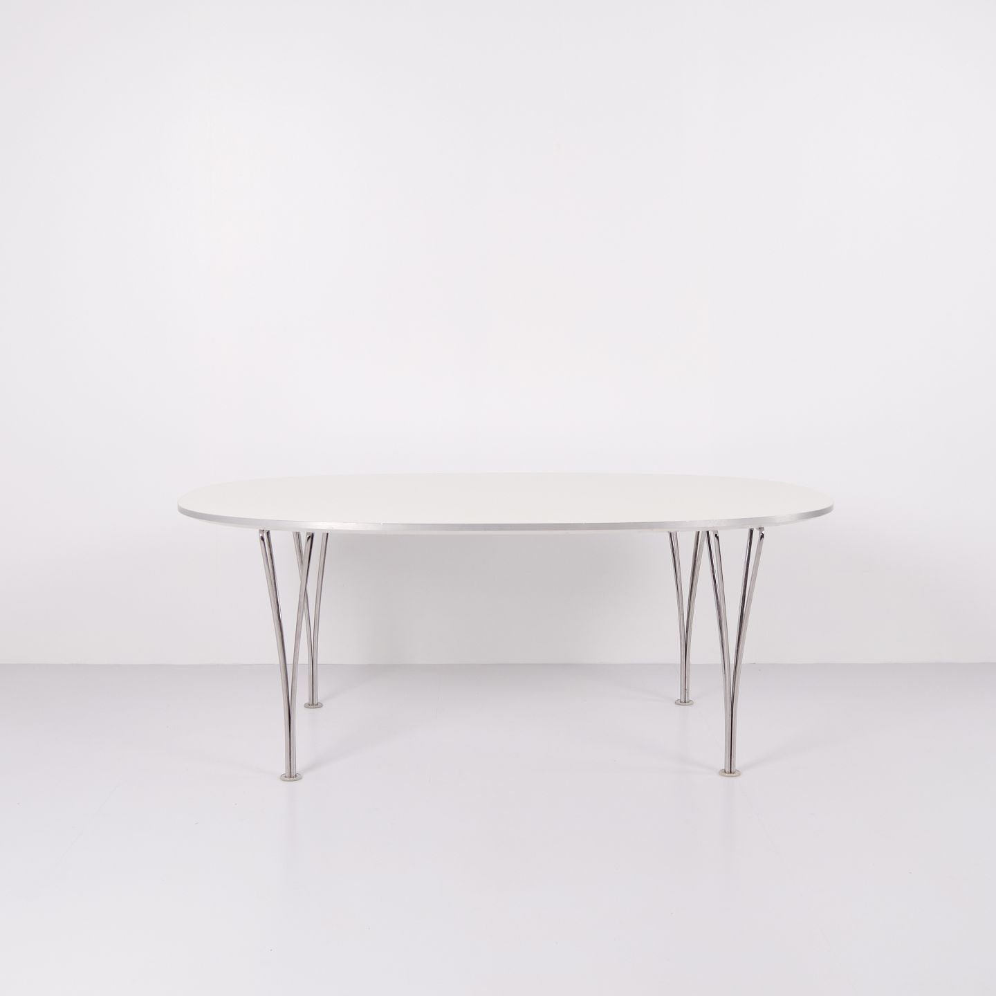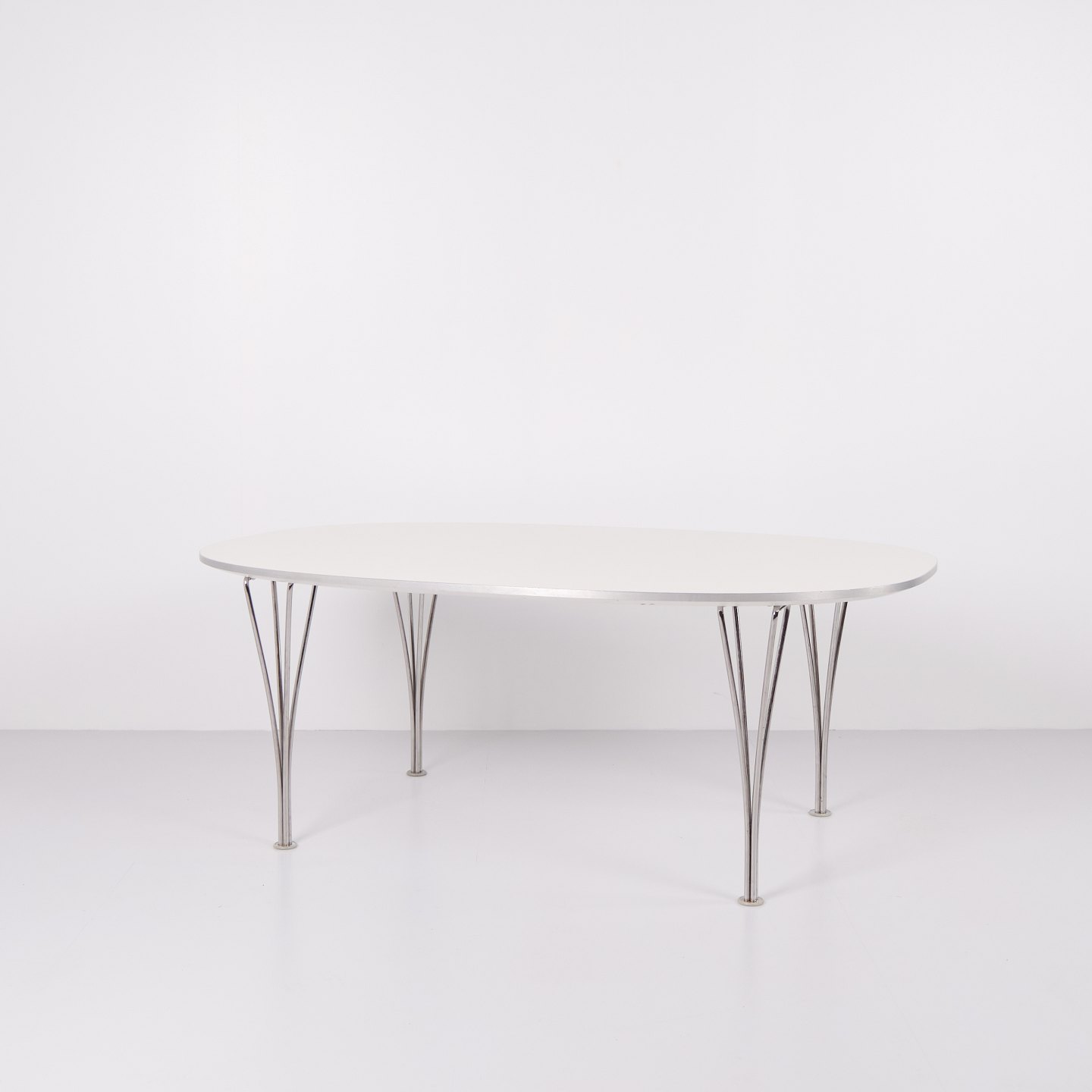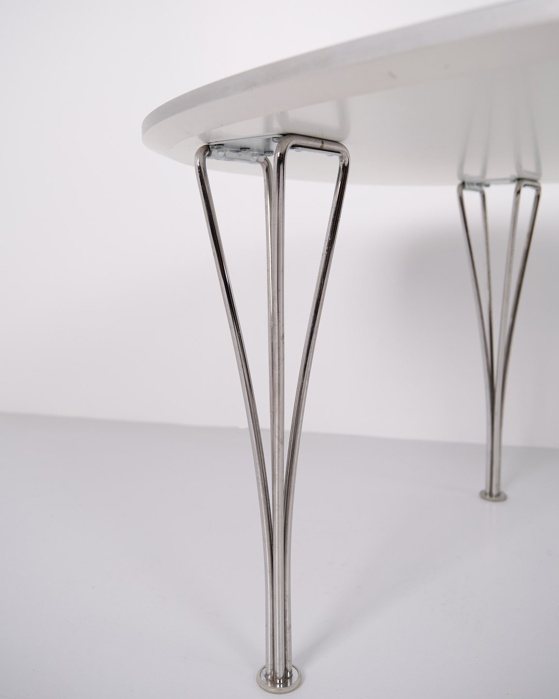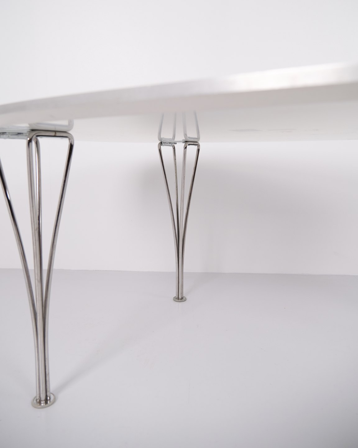Superellipse sofabord designet af Piet Hein, Bruno Mathsson og Arne Jacobsen for Fritz Hansen. Hvid laminat med aluminiumskant. Klassisk dansk design.