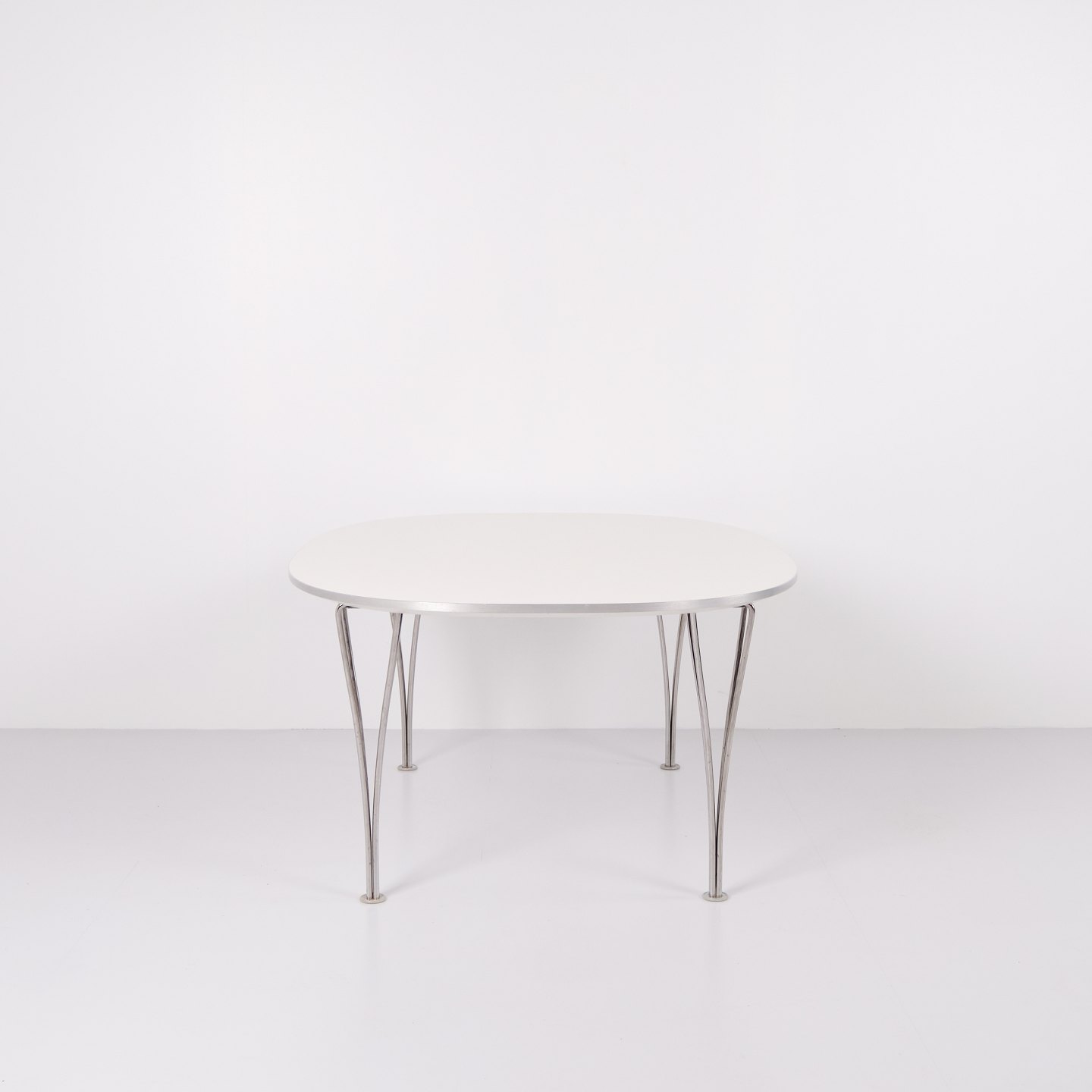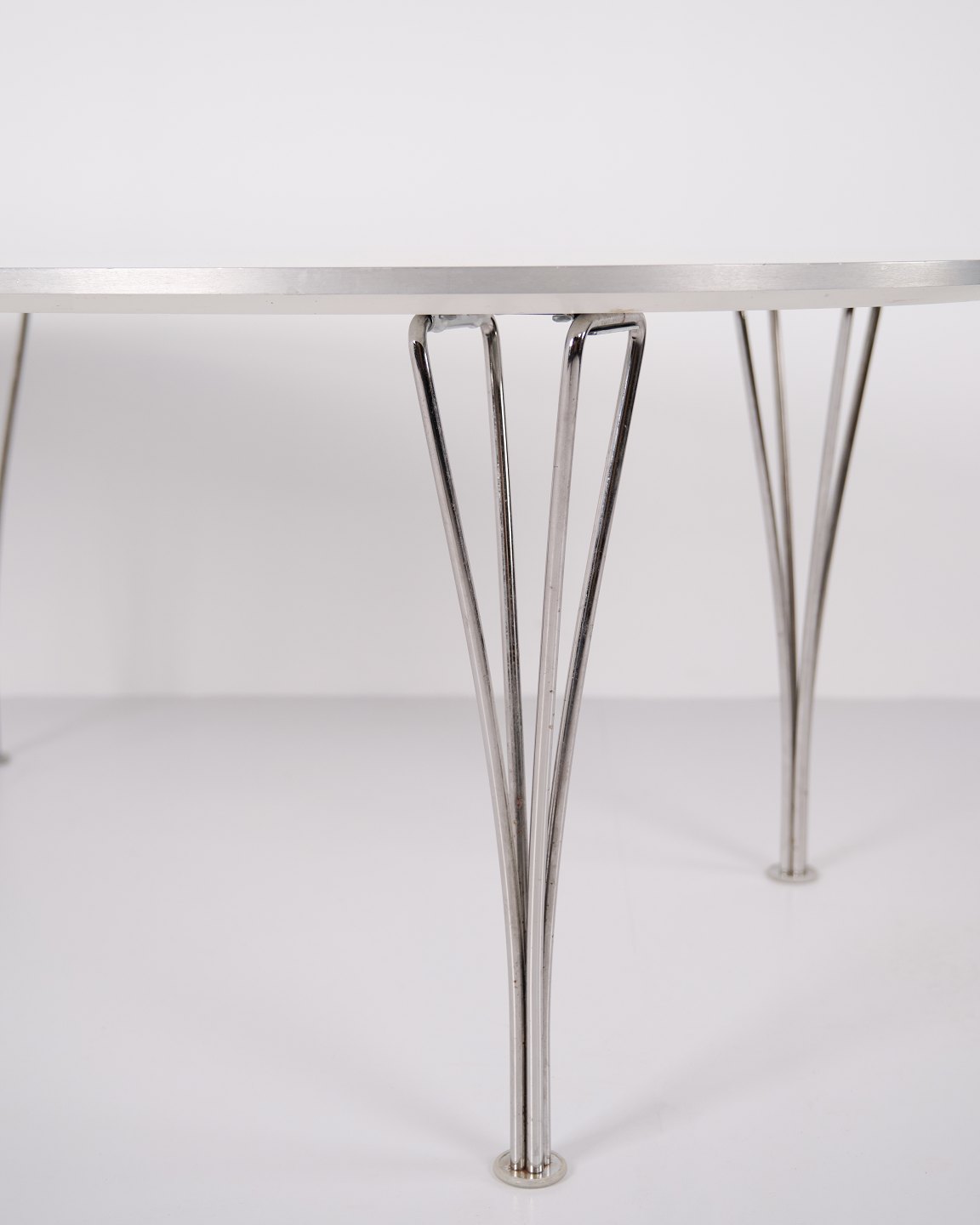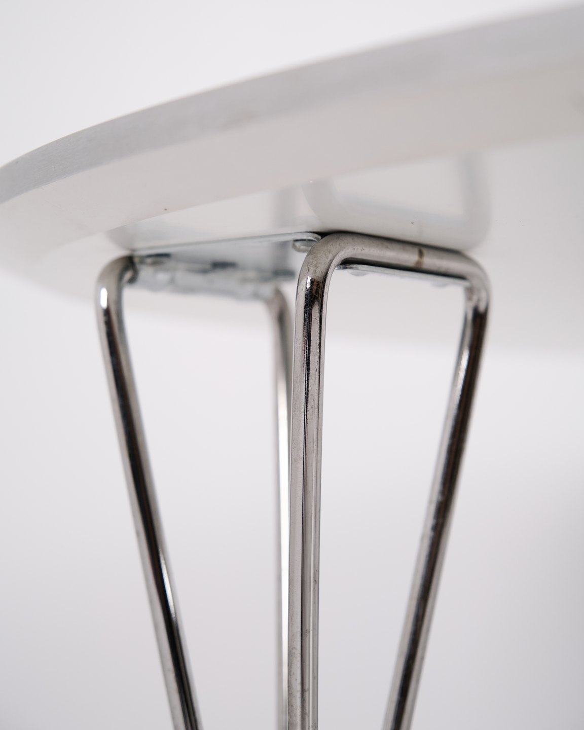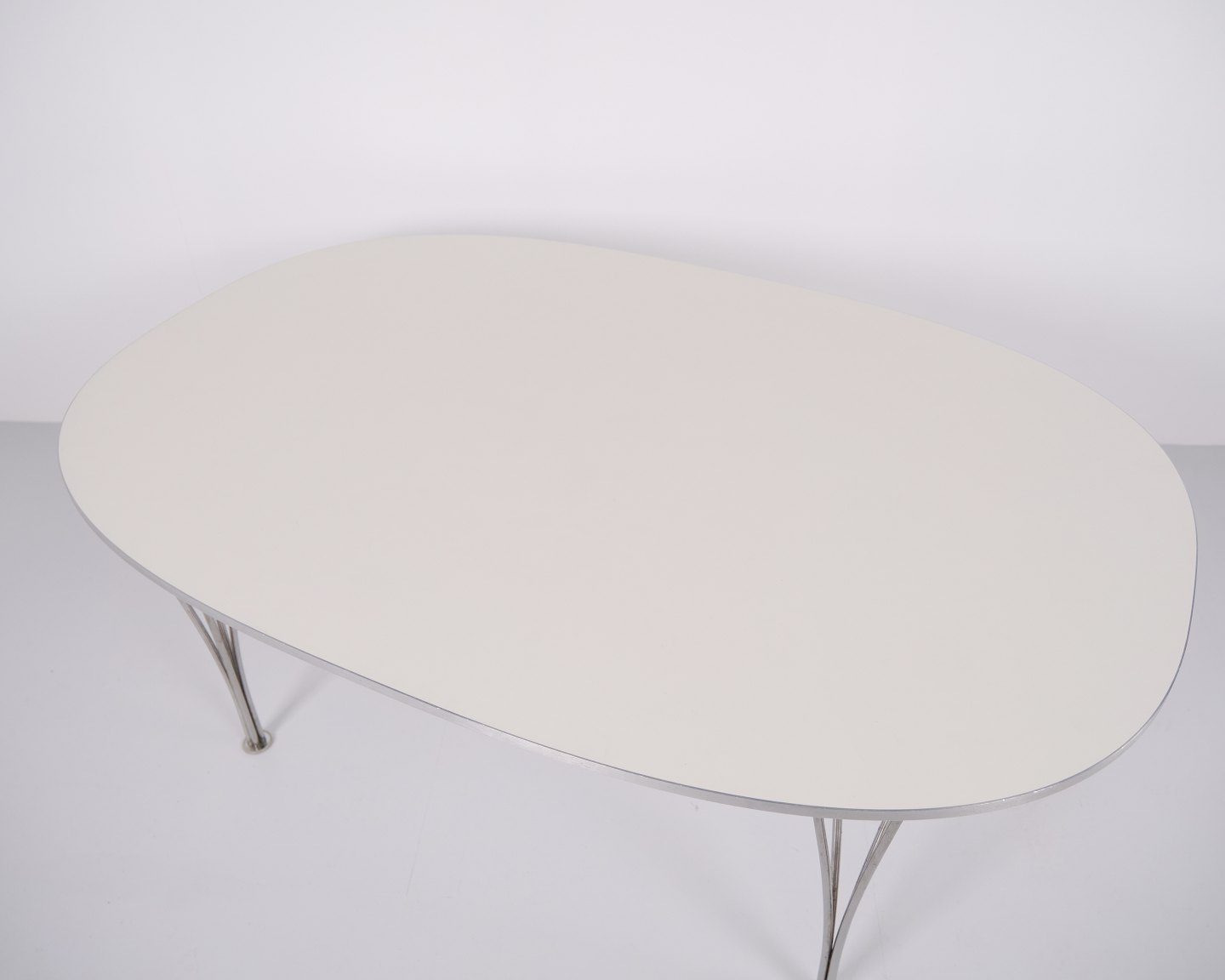 Superellipse sofabord designet af Piet Hein, Bruno Mathsson og Arne Jacobsen for Fritz Hansen. Hvid laminat med aluminiumskant. Klassisk dansk design.