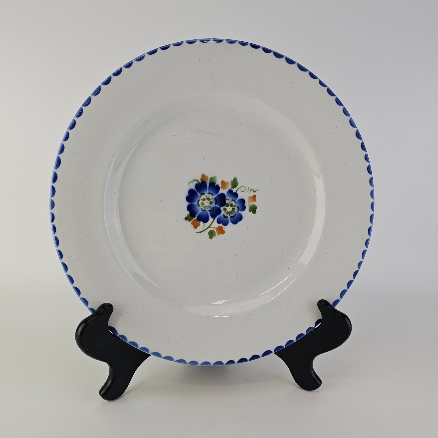 Hvidt fajancestel i stelform Sterling med motiv af blå blomster og blå prikker på kanten.