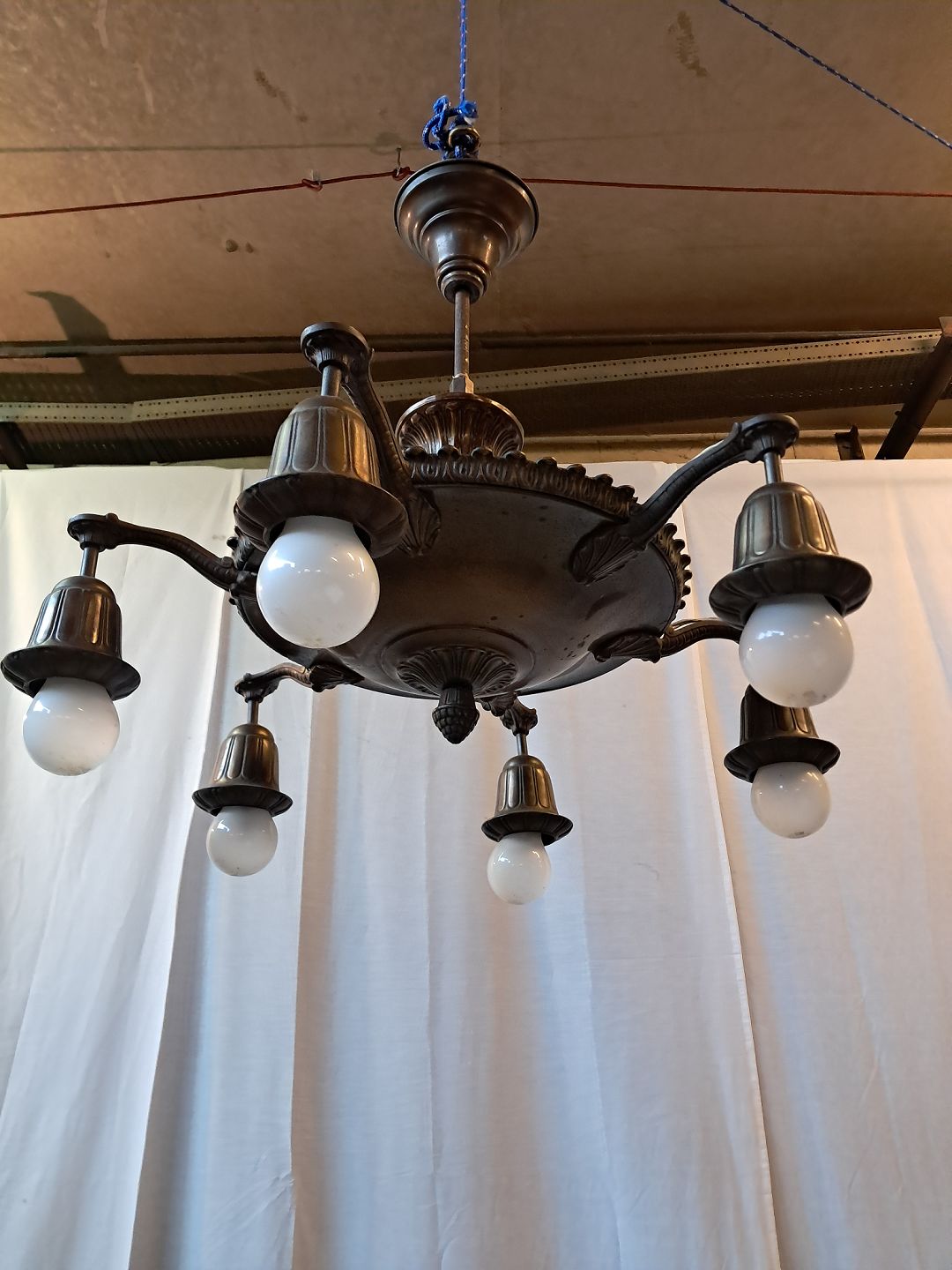 Lysekrone i bruneret messing, fra 1930erne.
