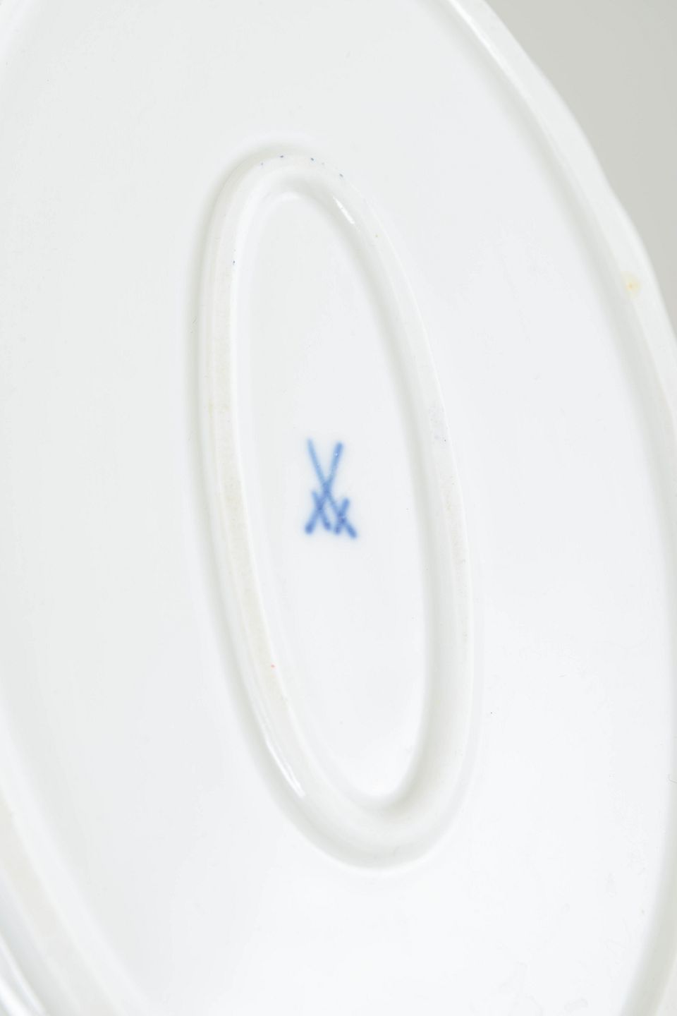 Oval skål i håndmalet porcelæn med Blå Orkidé dekoration. Fremstillet hos Meissen og mærket med Meissens krydssværd. Annulleret med to indridsede streger under bunden.
