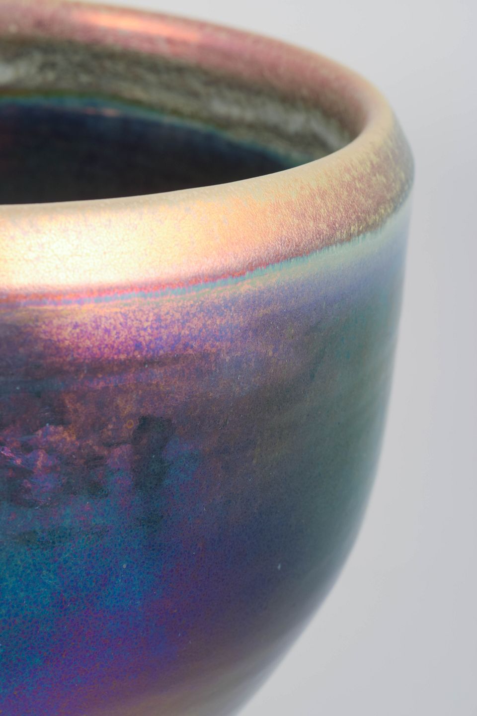 Meget stor drejet gulvvase eller plantekrukke i kraftigt stentøj med blank flerfarvet luster-glasur i violette, blå, grønne og rosa nuancer. Fremstillet hos Mobach i 1970’erne.