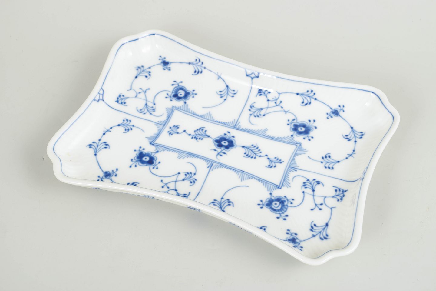Bakke i håndmalet porcelæn fra Musselmalet Riflet med klassisk underglasurdekoration i koboltblå og riflede felter. Model 1/269. H. 16 cm, D. 24 cm. Annulleret med én indridset streg under bunden. Fremstillet i 1965.