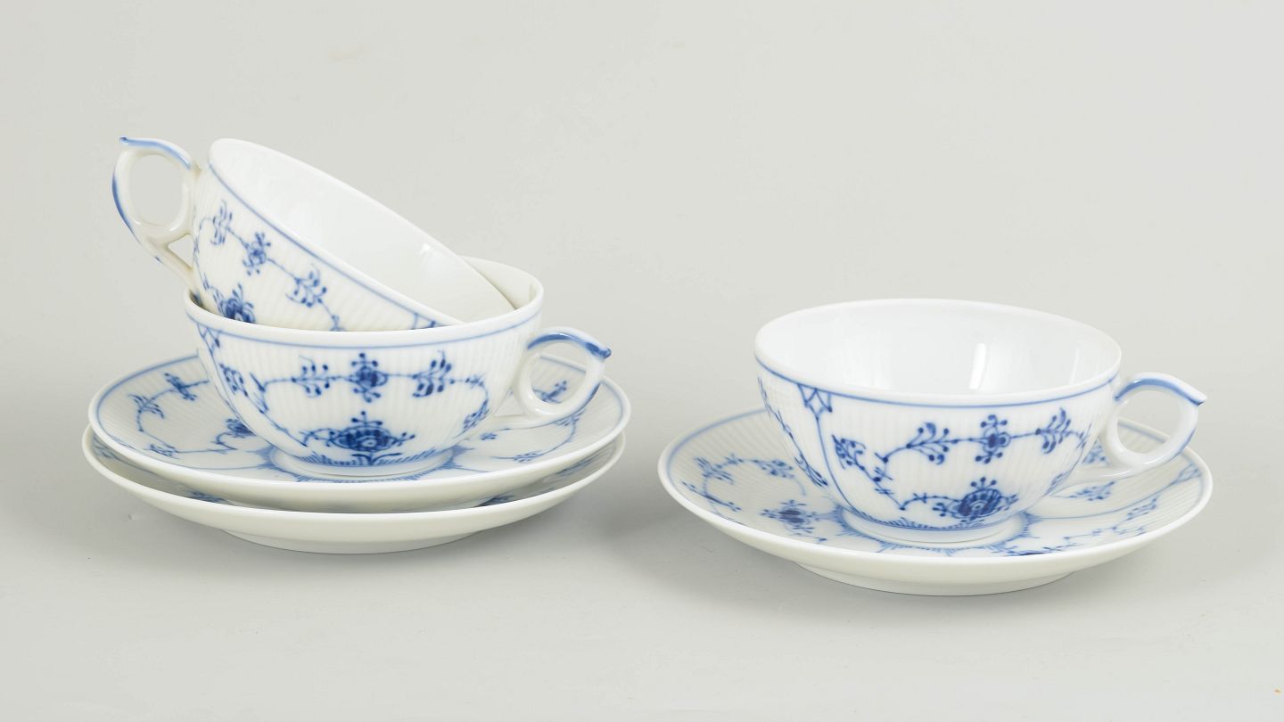 Sæt af tre tekopper med tilhørende underkopper i håndmalet porcelæn fra Musselmalet Riflet med klassisk underglasurdekoration i koboltblå og riflede felter. Model 1/76. Kopper H. 5 cm, D. 12 cm. Underkopper D. 15 cm. Første sortering. Fremstillet i 1960/80’erne.