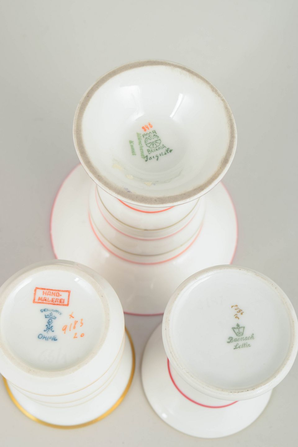 Tre små vaser i porcelæn med klassiske art deco former og dekoration i hvide nuancer med koralrøde stafferinger og guldkant. Vaserne fremstår med elegante proportioner og karakteristisk stil fra tysk porcelænsproduktion i mellemkrigstiden.
