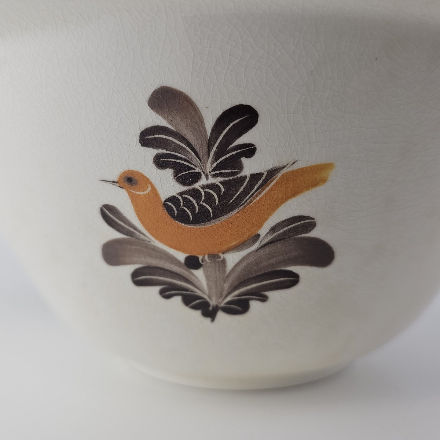 Hvidt fajancestel i stelform G med motiv af en orange og brun fugl og kant.