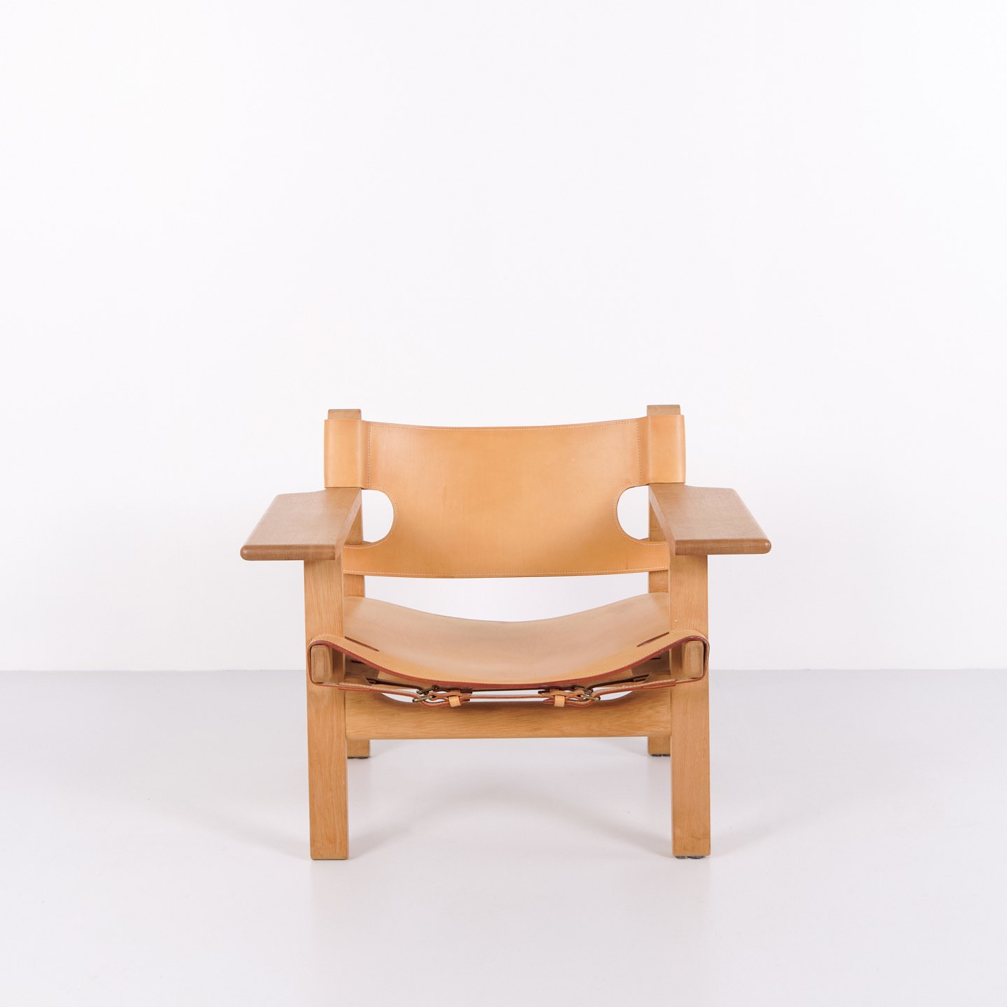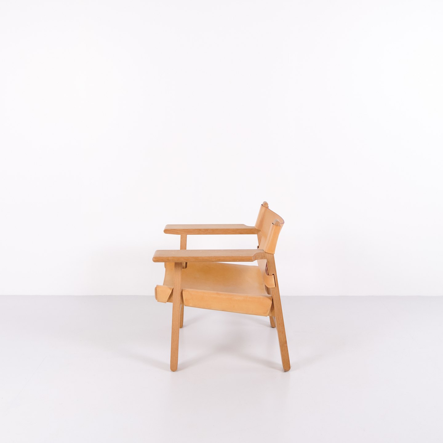 Børge Mogensen Den Spanske Stol model BM2226 i naturligt patineret kernelæder fra 1960’erne. Klassisk dansk designikon med robust udtryk.