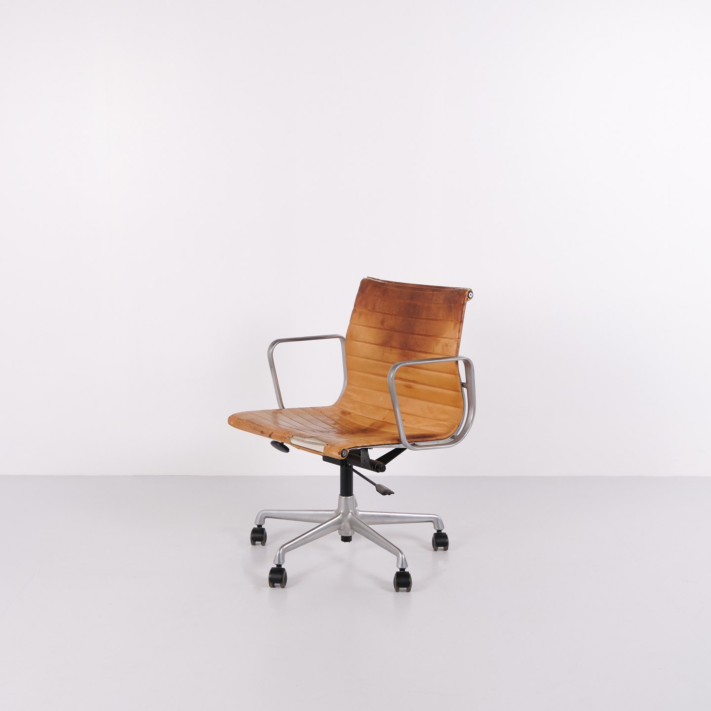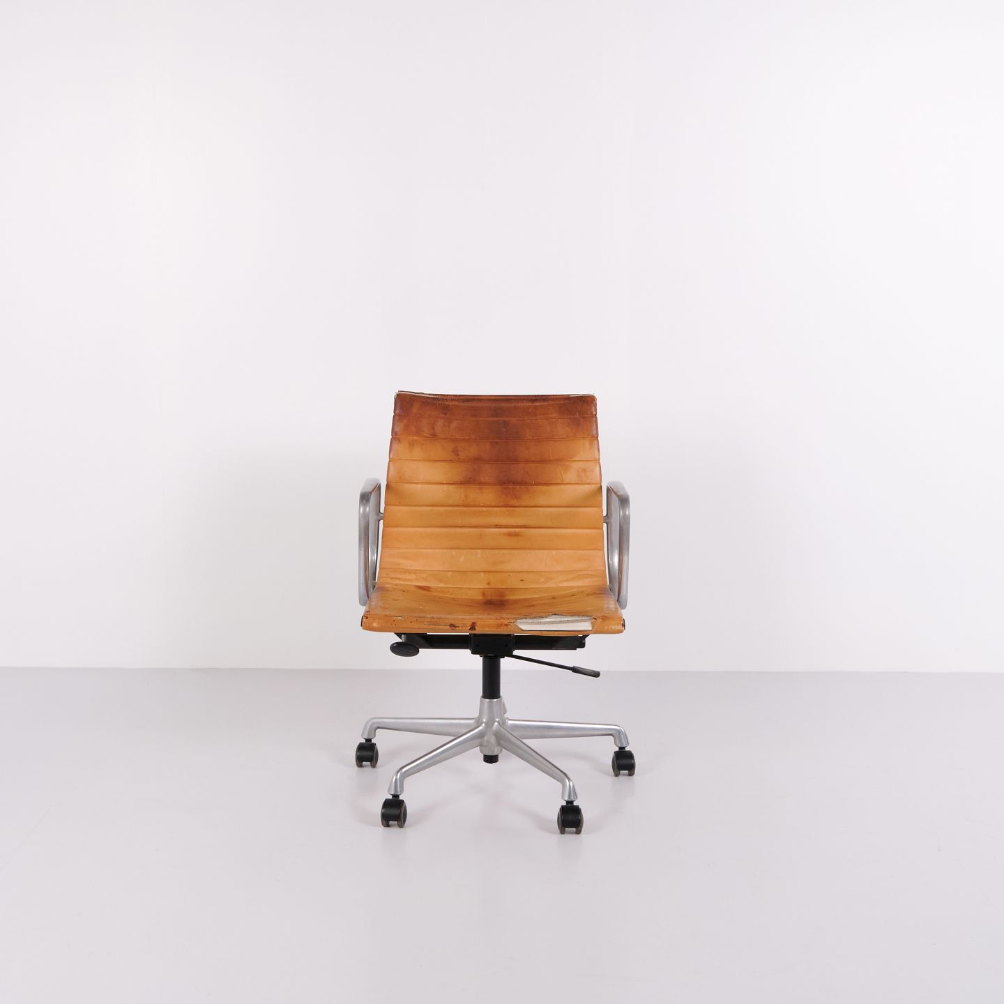 Charles Eames Kontorstol Model EA 117 i Aluminium og Cognacfarvet Læder, Vitra