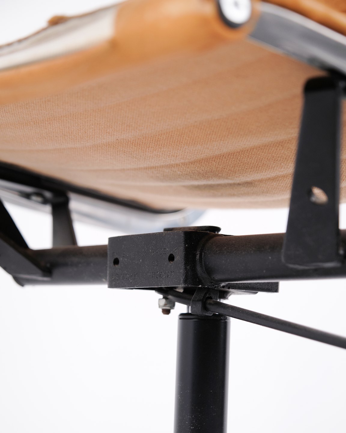 Stel af aluminium, sæde og ryg betrukket med cognacfarvet læder, ryg med hopsak, fempas fod monteret med hjul. Højdejusterbar, ryg med vippefunktion. Designet in 1958, fremstillet hos Vitra.