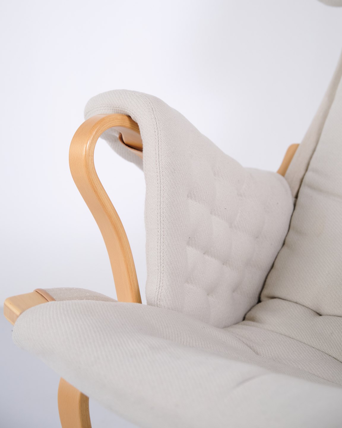 Pernilla lænestol med tilhørende skammel, model 69, designet af Bruno Mathsson og fremstillet af DUX som 35 års jubilæumsudgave. Stolen er udført i bøgetræ med polstring i lyst stof og har et karakteristisk, ergonomisk formsprog, der følger kroppens naturlige kurver og sikrer høj komfort.
