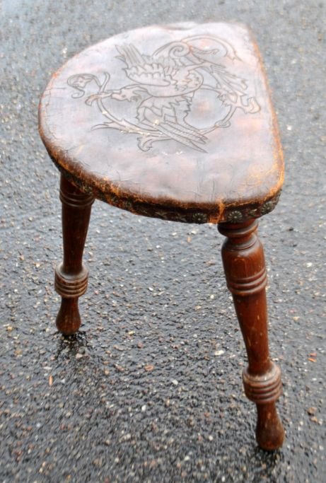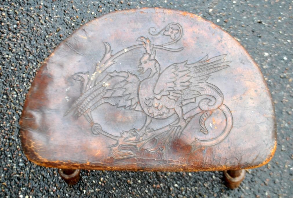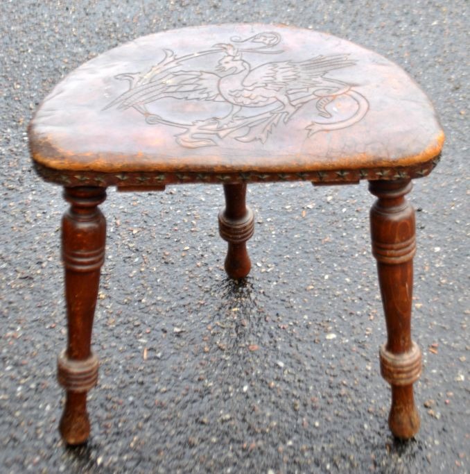 Trebenet skammel i træ med lædersæde, 19. årh. Poleret bøg. Udskåret læder med dekoration af fugl. Nitter i form af stjerner og blomster. H: 39 cm. B: 40 cm. D: 33 cm.
