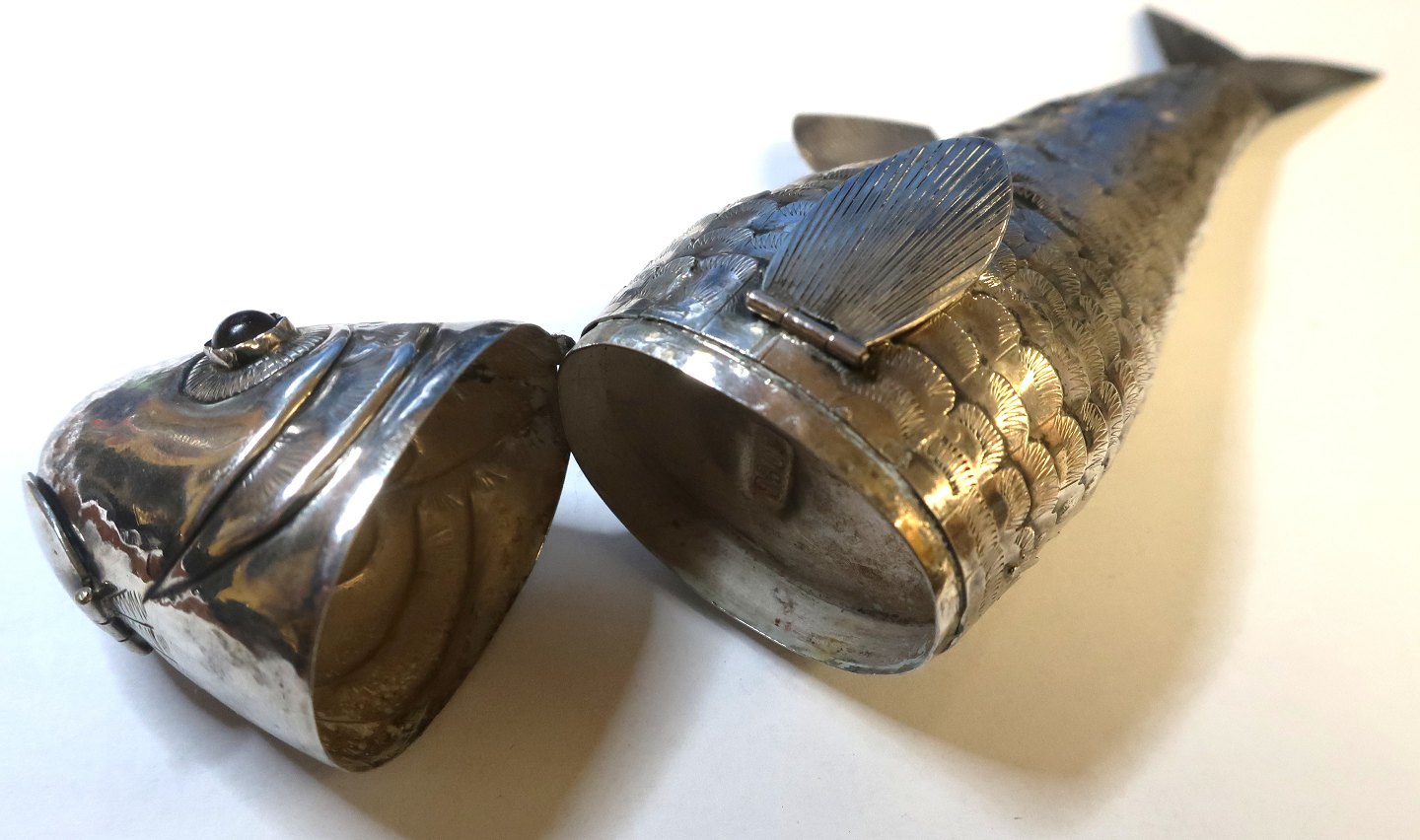 Sølv hovedvandsæg i form af stor fisk med røde sten (830). Længde 17 cm