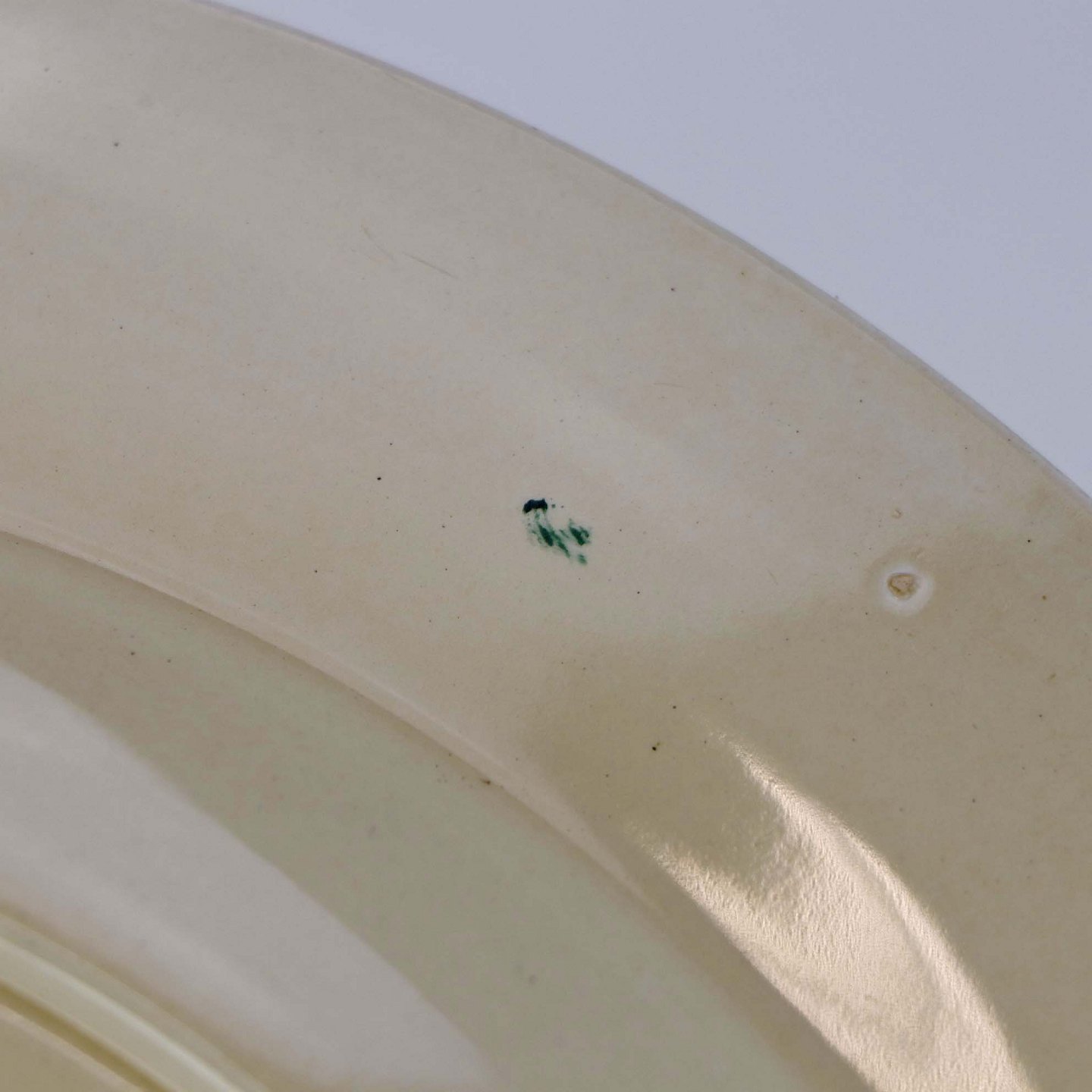 Fremstår med ridser i bunden af fadet, brugsspor på dekorationen samt en grøn plet under glasuren på fadets bagside og ujævnheder i glasuren.