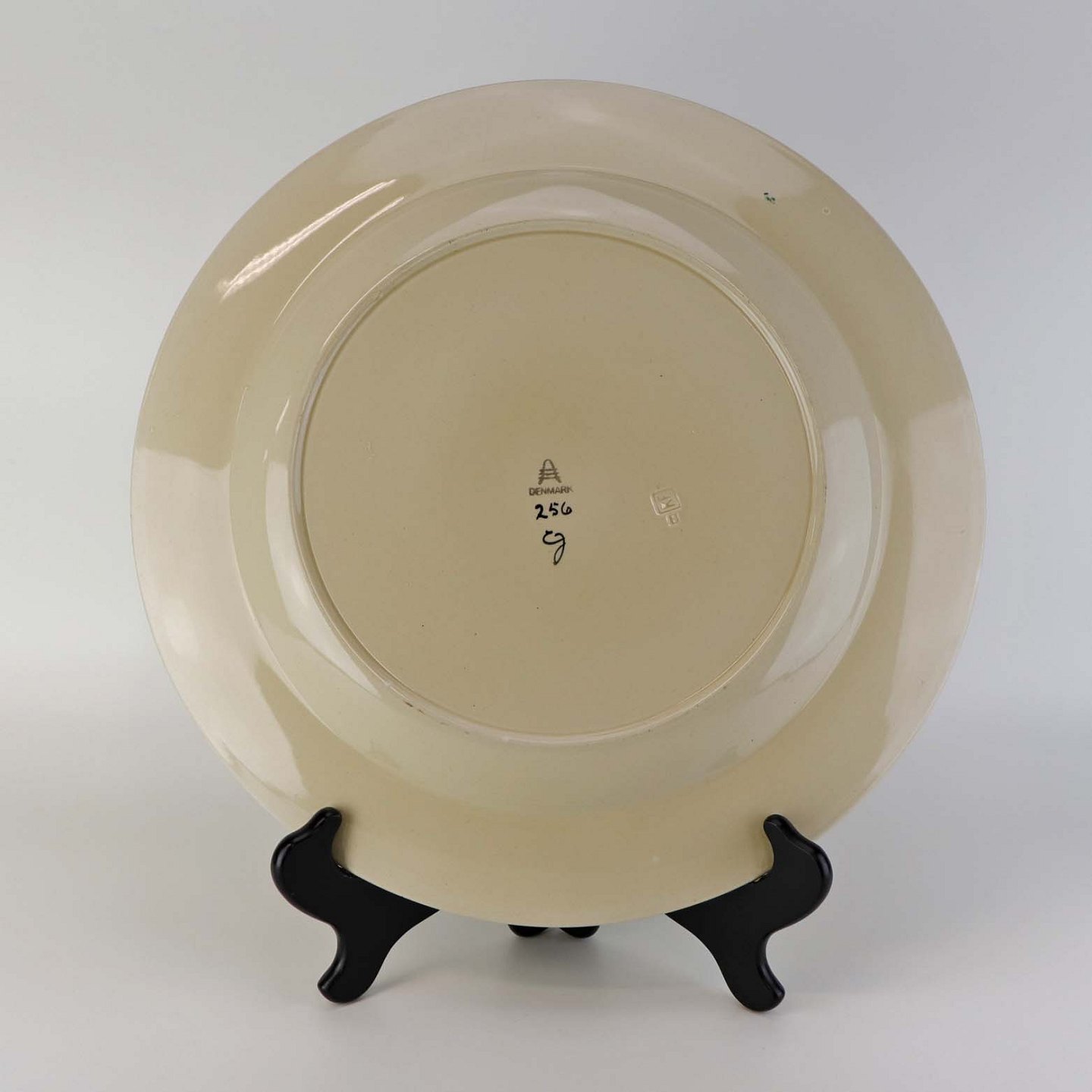 Rundt serveringsfad i fajance fra stellet Dragsholm fremstillet i perioden 1934-1965. Nr 256