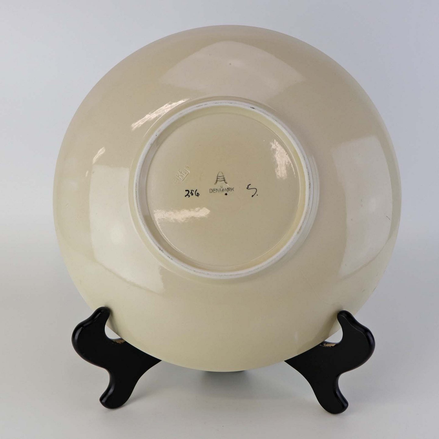 Rundt kagefad i fajance fra stellet Dragsholm fremstillet i perioden 1934-1965. Nr 256