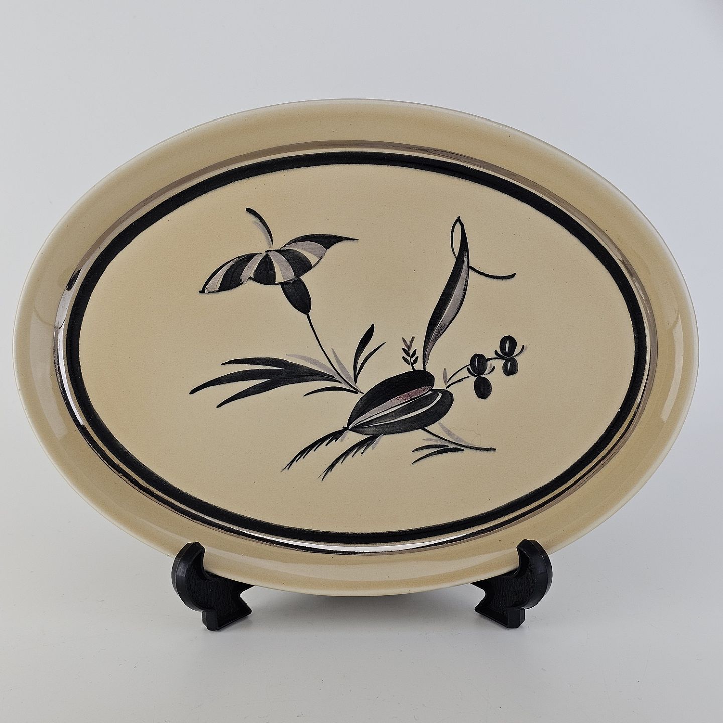 Råhvidt fajancestel i stelform E med dekoration af naturmotiver i sølv og sort farve.