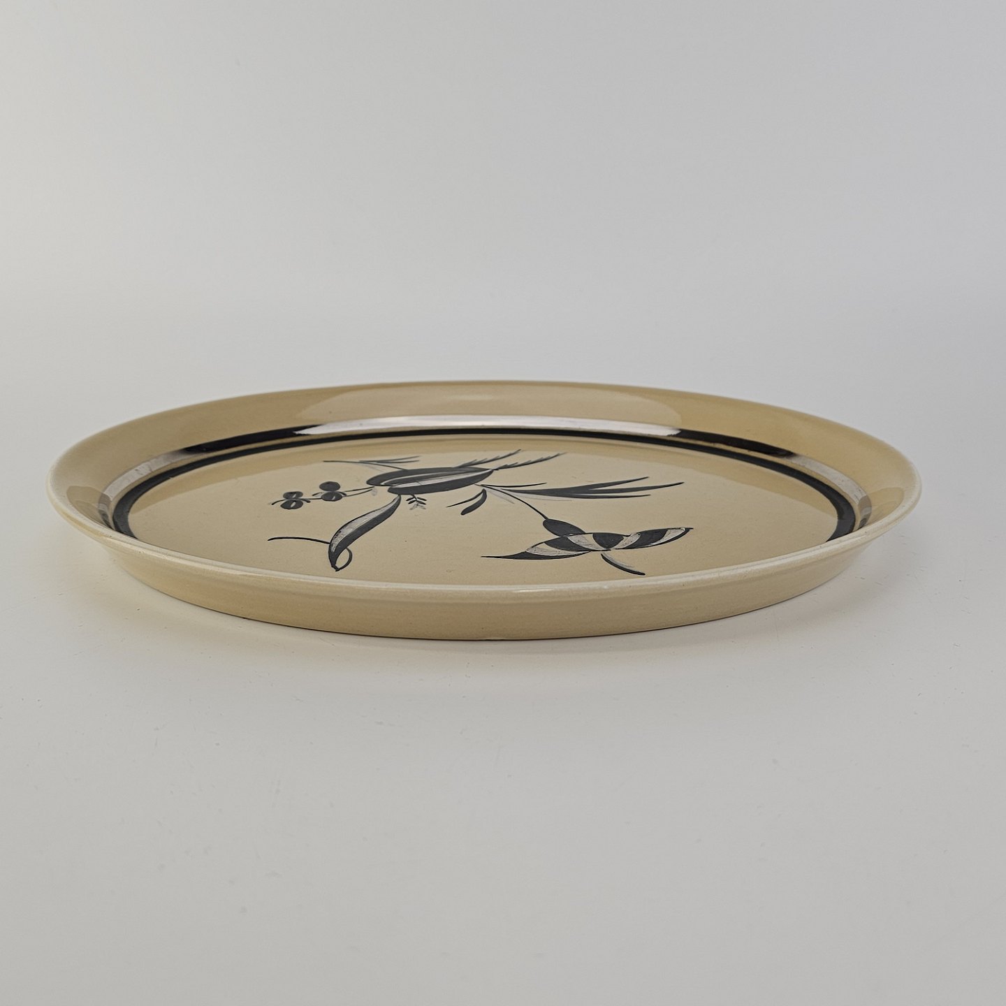 Aflangt ovalt fad i fajance fra stellet Dragsholm fremstillet i perioden 1934-1965.