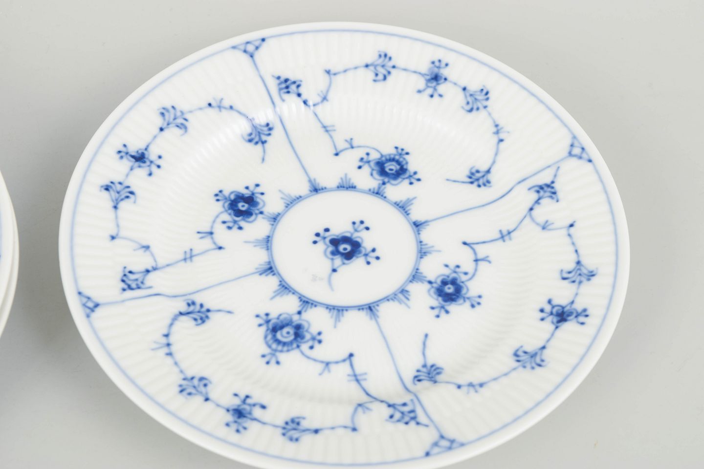 Royal Copenhagen Musselmalet Riflet, sæt af tre kagetallerkener.