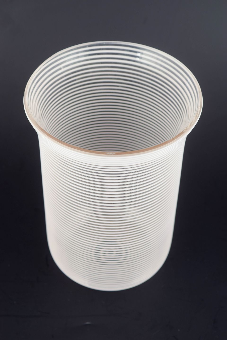 Cylinderformet kunstglasvase i klart glas med tætliggende horisontale tråddekorationer, der skaber en struktureret og optisk vibrerende overflade.
