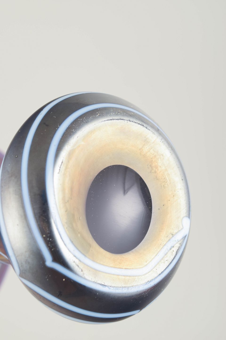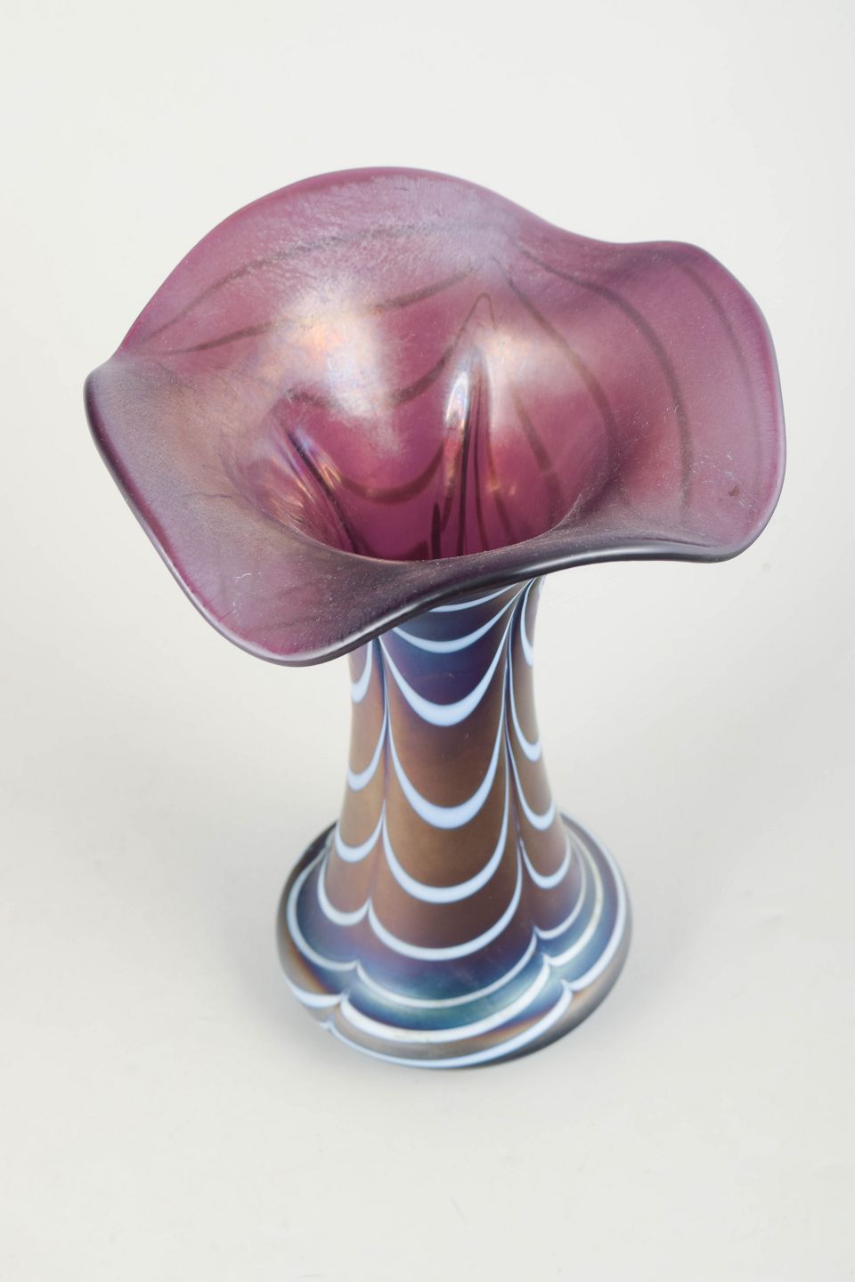 Større vase i mundblæst glas med rundet korpus og bred, let udadbøjet rand. Overfladen fremstår med silkemat iriserende finish i gyldne, blålige og let violette nuancer, som skifter afhængigt af lyset. Den harmoniske, balancerede form kombineret med det metalliske farvespil er karakteristisk for Loetz’ produktion i 1920’erne, hvor enkle klassiske former blev forenet med raffinerede overfladeeffekter.