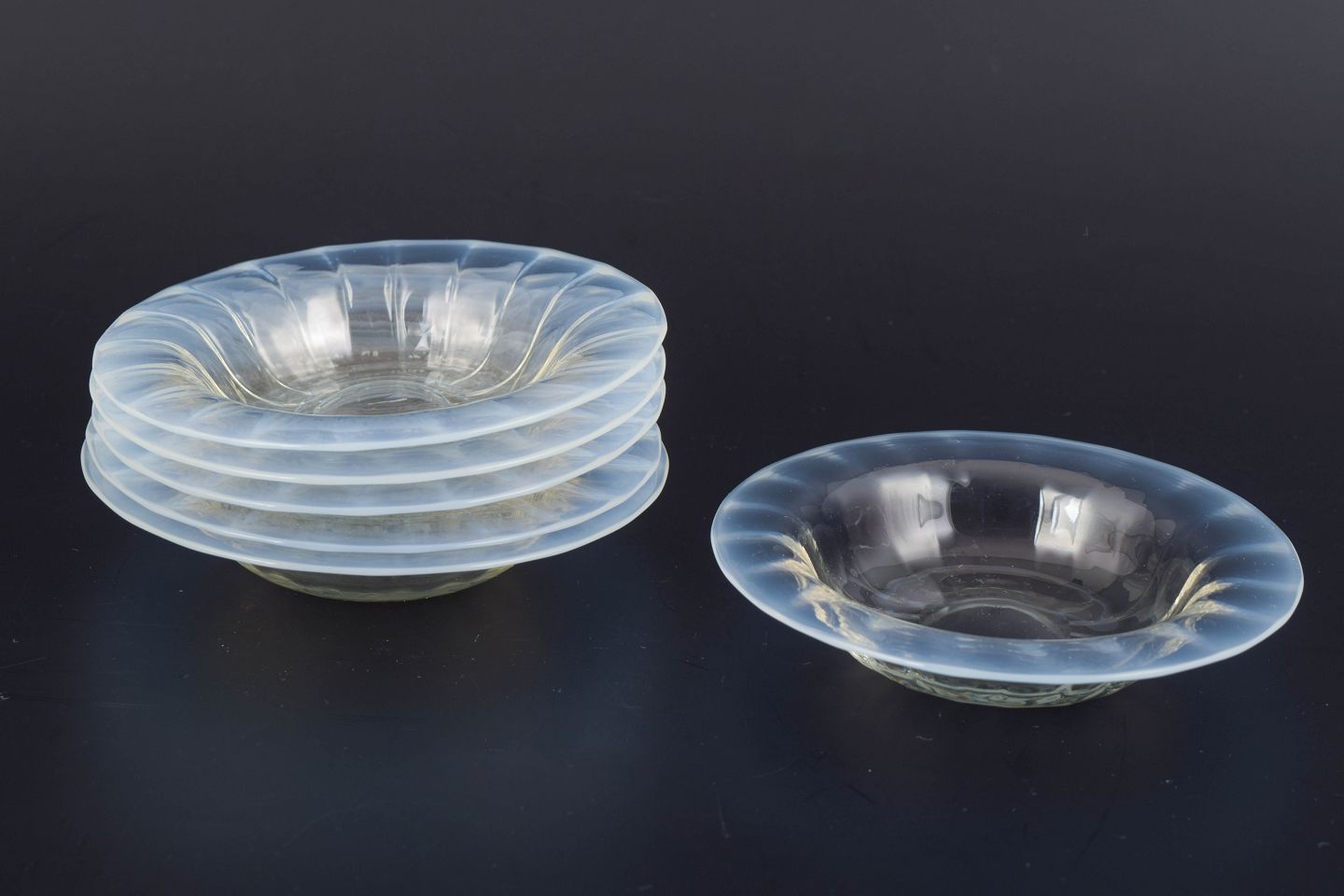 Seks små kunstglasskåle udført i europæisk studioglas med klar, let rillet form og blødt buet profil. Skålene har en harmonisk, organisk silhuet og fremstår med elegant gennemsigtighed.