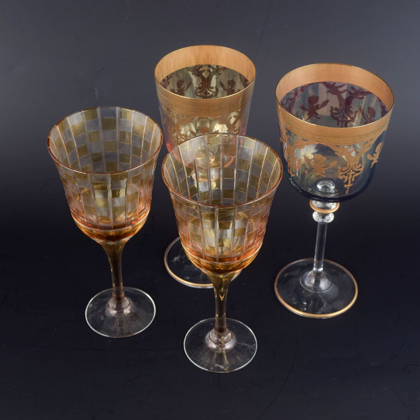 Elegante rødvinsglas i facetslebet og forgyldt krystal med ravfarvet cuppa og slank stilk. Dekoreret med geometrisk mønster og delvis mat forgyldning langs randen, typisk for bøhmisk glasproduktion fra mellemkrigstiden.