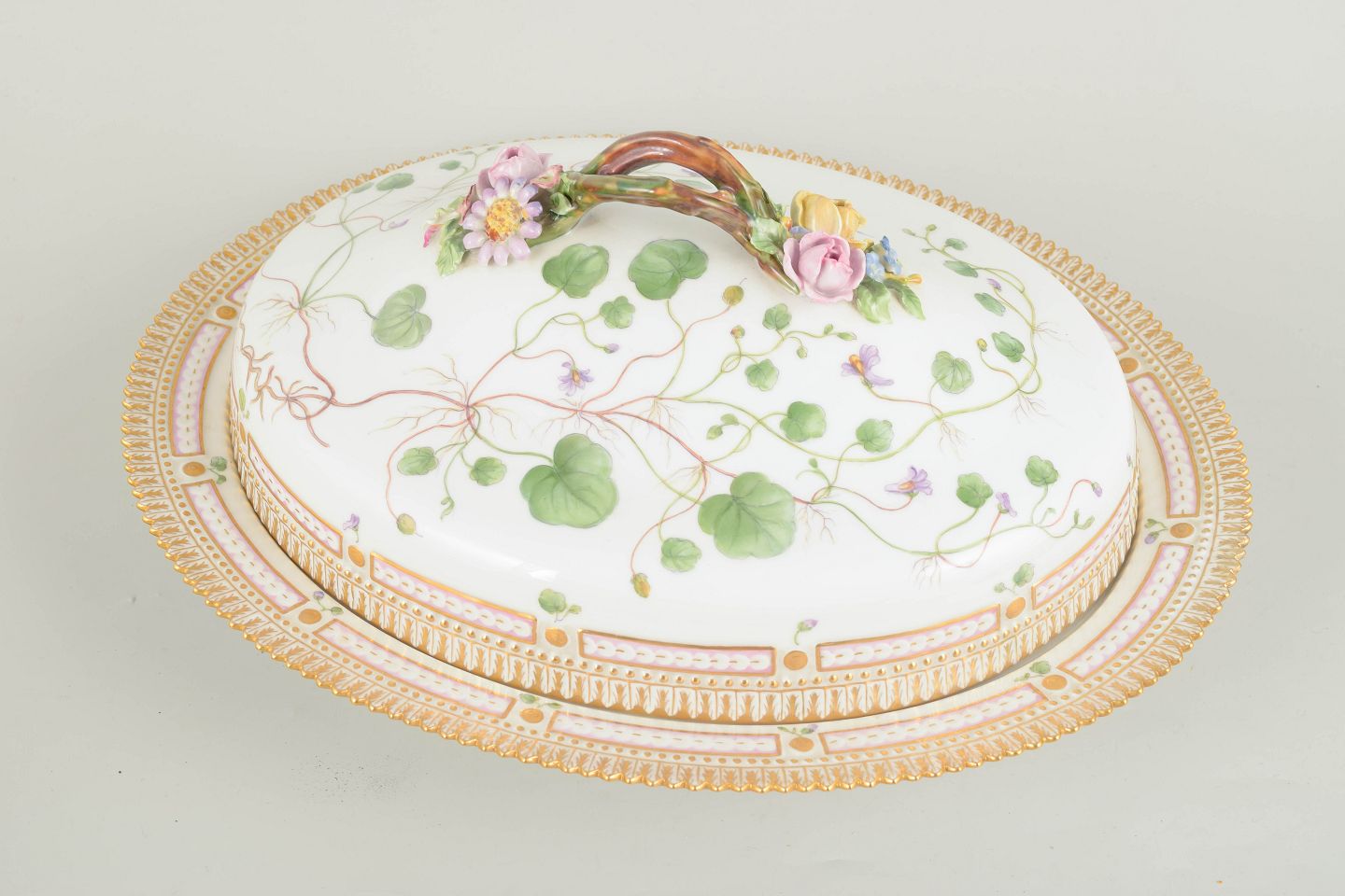 Imponerende og monumentalt udført lågfad i håndmalet porcelæn fra Flora Danica-serien, dekoreret med botanisk motivet Linaria Cymbalaria Mill., sirligt gengivet med videnskabelig præcision og forfinet penselføring. Låget er rigt udsmykket med naturalistiske blomster og slyngende ranker, afsluttet med relief modelleret knop med blomsterdekoration. Foden og randen er dekoreret med forgyldte detaljer og klassisk kantornamentik. Model 20/3567.