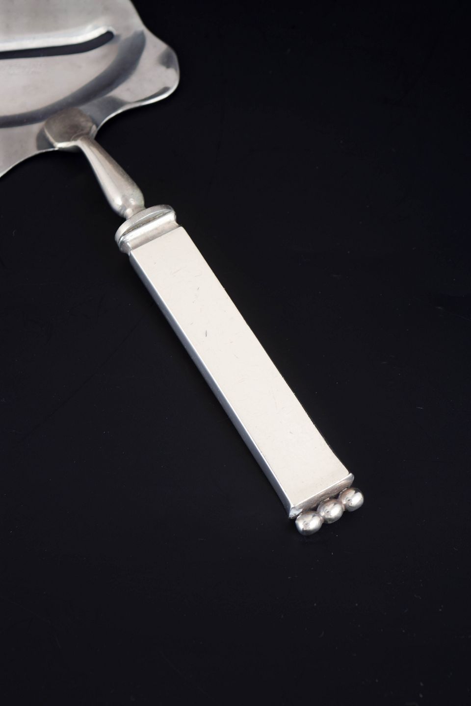 Art deco ostehøvl i tretårnet sølv og rustfrit stål. Model nummer 27 med dekorativt skaft i relief med stiliseret blomstermotiv. Fremstillet hos Evald Nielsen.