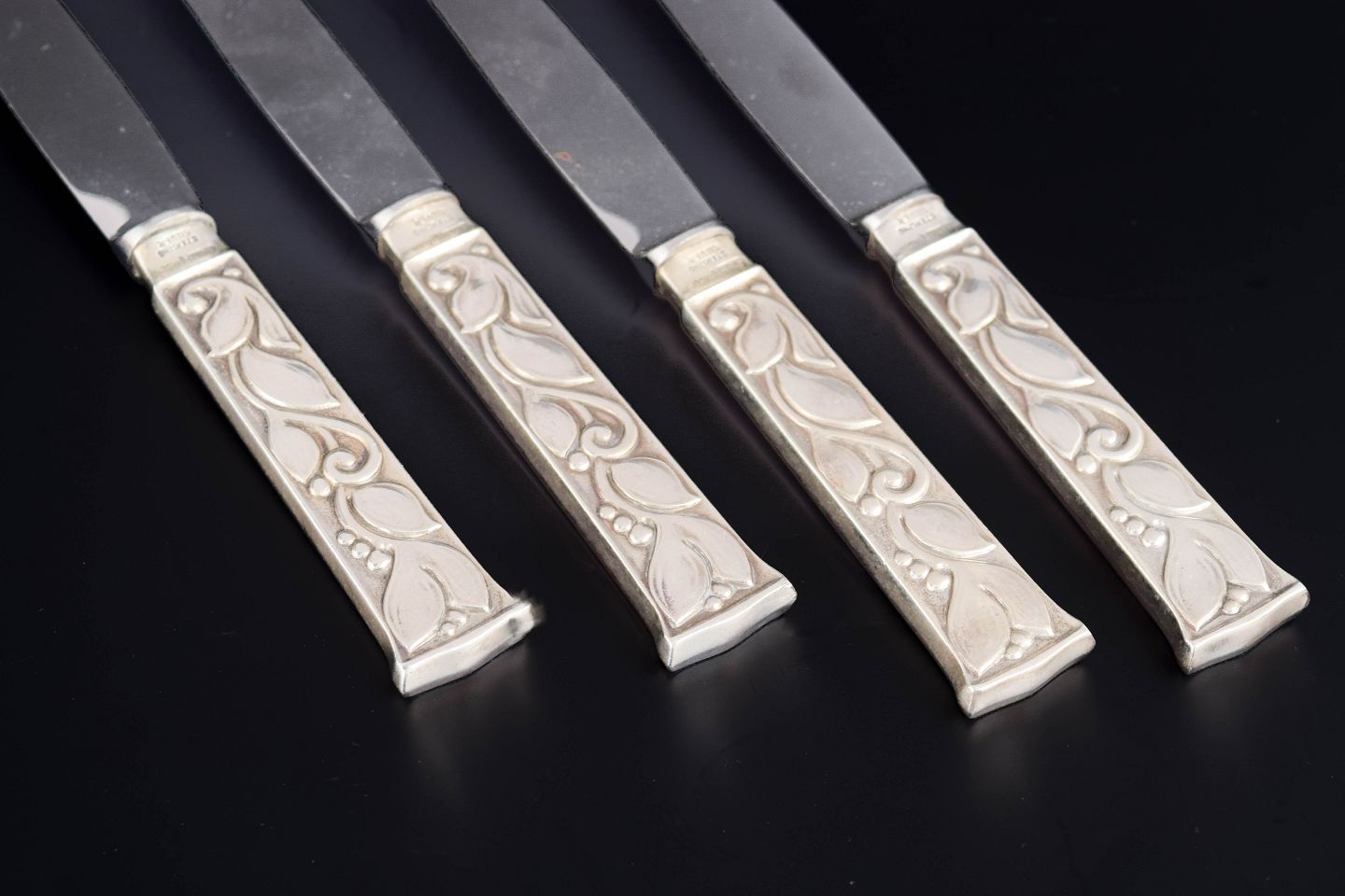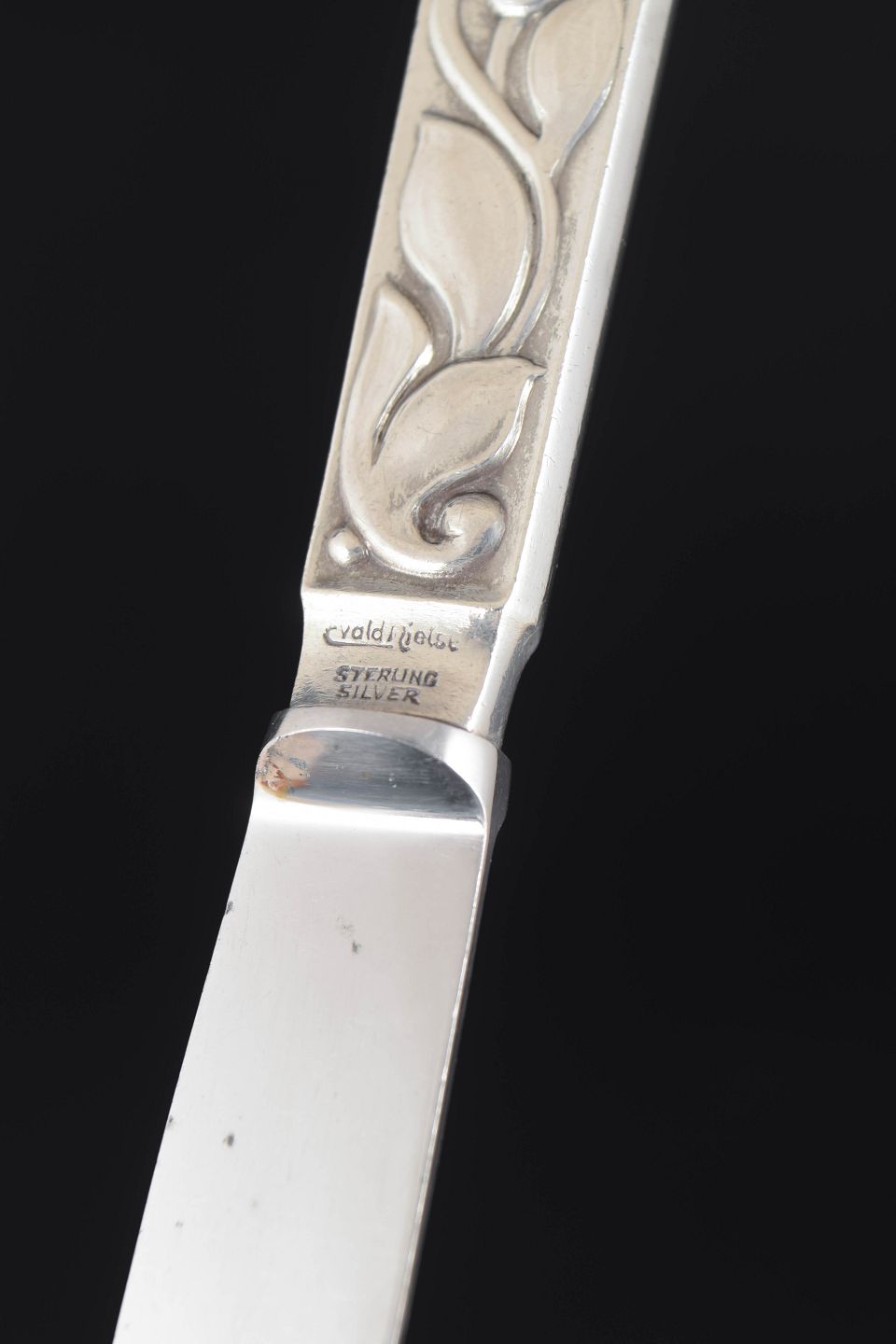 Elegante frugtknive i sterlingsølv og rustfrit stål med klassisk, let afrundet skaftform og glat klinge. Fremstillet hos Evald Nielsen.