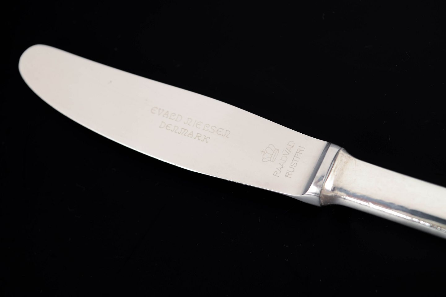 Elegante middagsknive i sterlingsølv og rustfrit stål. Model nummer 14 med klassisk, let afrundet skaftform med diskret perlekant og glat klinge. Fremstillet hos Evald Nielsen.