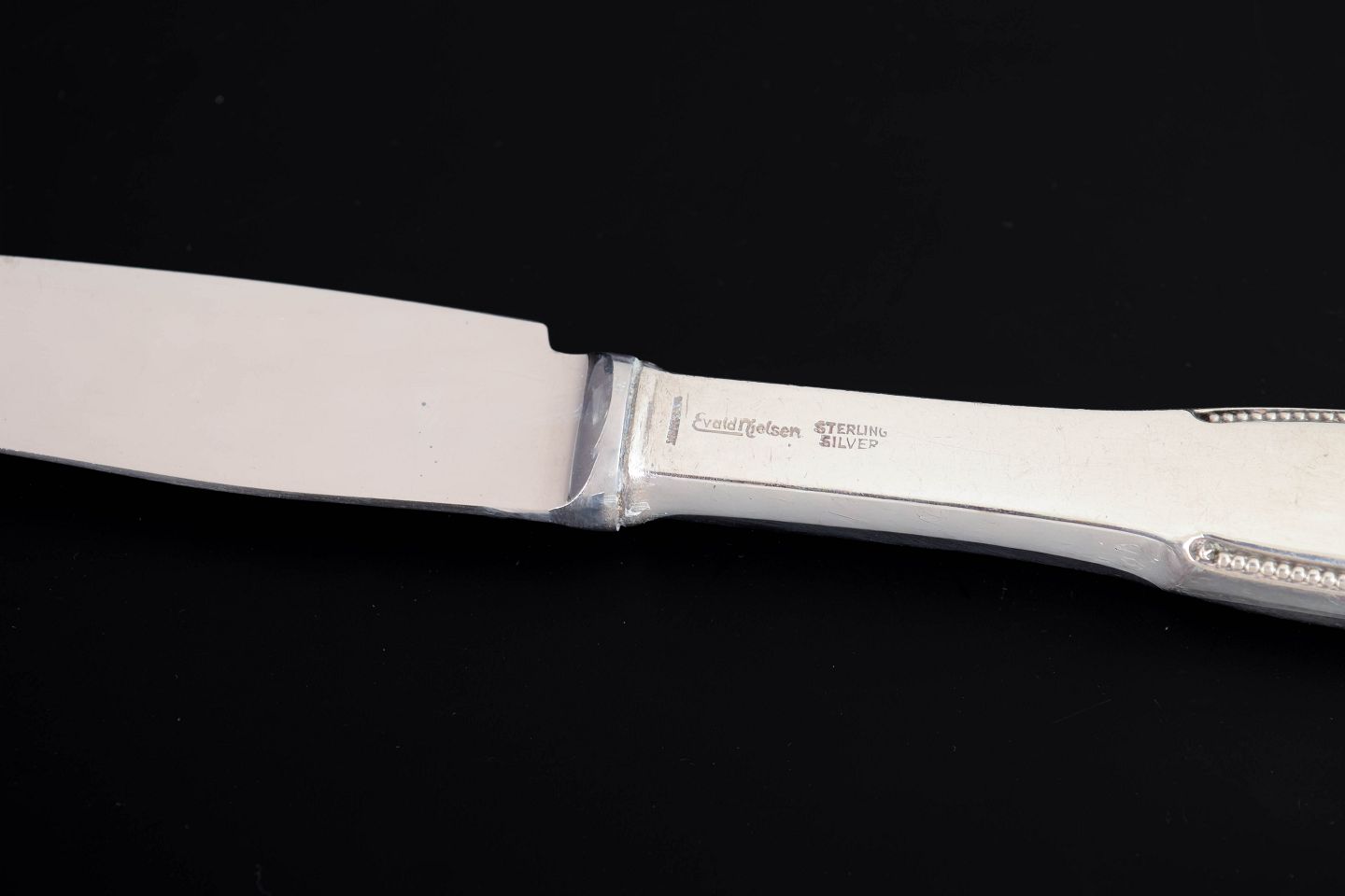 Elegante frokostknive i sterlingsølv og rustfrit stål. Model nummer 14 med klassisk, let afrundet skaftform med diskret perlekant og glat klinge. Fremstillet hos Evald Nielsen.